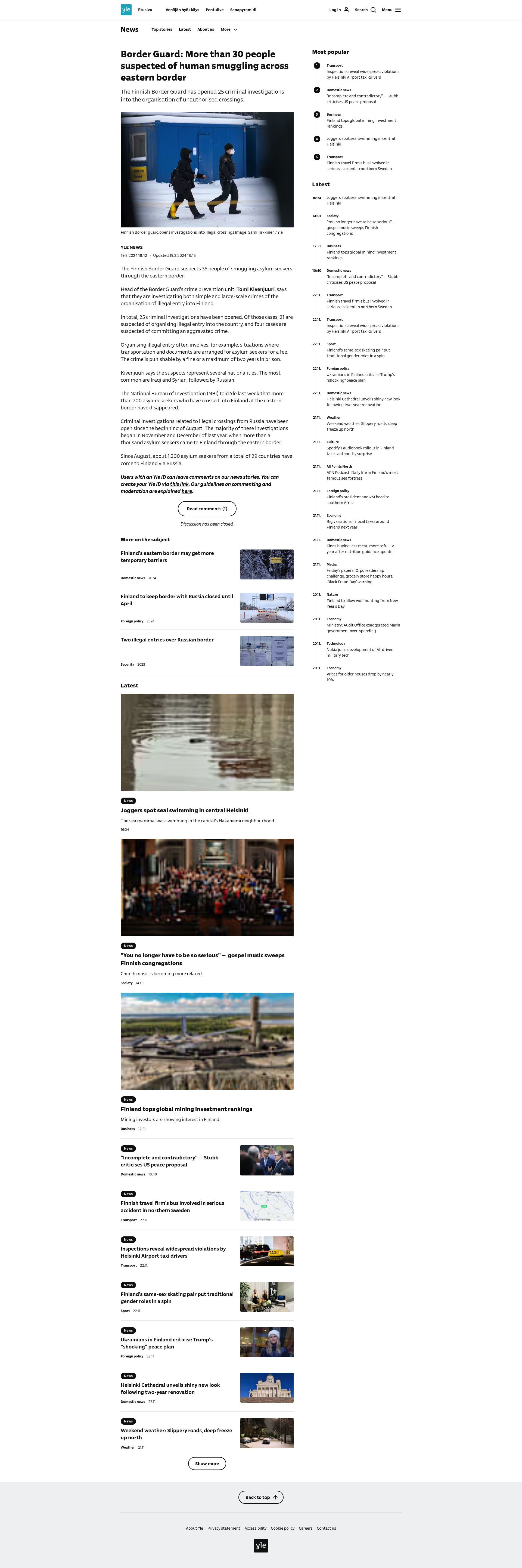 The Finnish Border Guard has opened 25 criminal investigations into the organisation of unauthorised crossings. More than 30 people are suspected of smuggling asylum seekers through the eastern border, with cases involving aiding illegal entry and related document forgery.