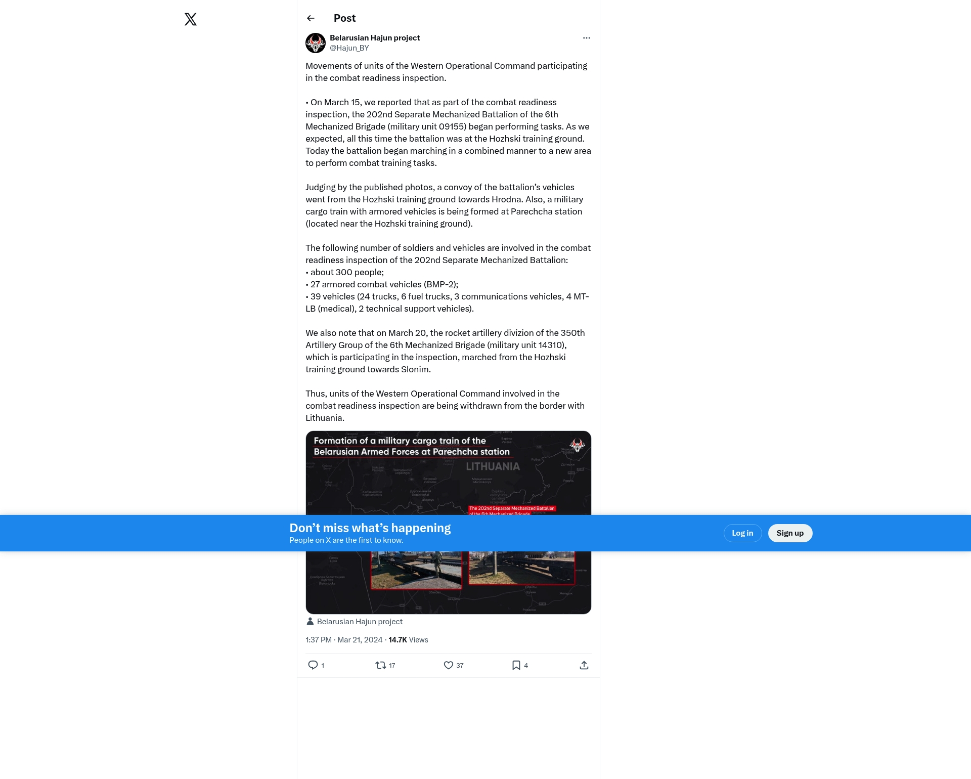 Units from the Western Operational Command of the Belarusian Armed Forces, specifically the 202nd Separate Mechanized Battalion of the 6th Mechanized Brigade and the rocket artillery division of the 350th Artillery Group, were involved in a combat readiness inspection. Convoys of battalion vehicles moved from the Hozhski training ground towards Hrodna, and a military cargo train with armored vehicles was formed at Parechcha station. The inspection involved approximately 300 personnel, 27 BMP-2 armored vehicles, and 39 other vehicles. The units participating in the exercise are reported to be withdrawing from the Lithuanian border area.