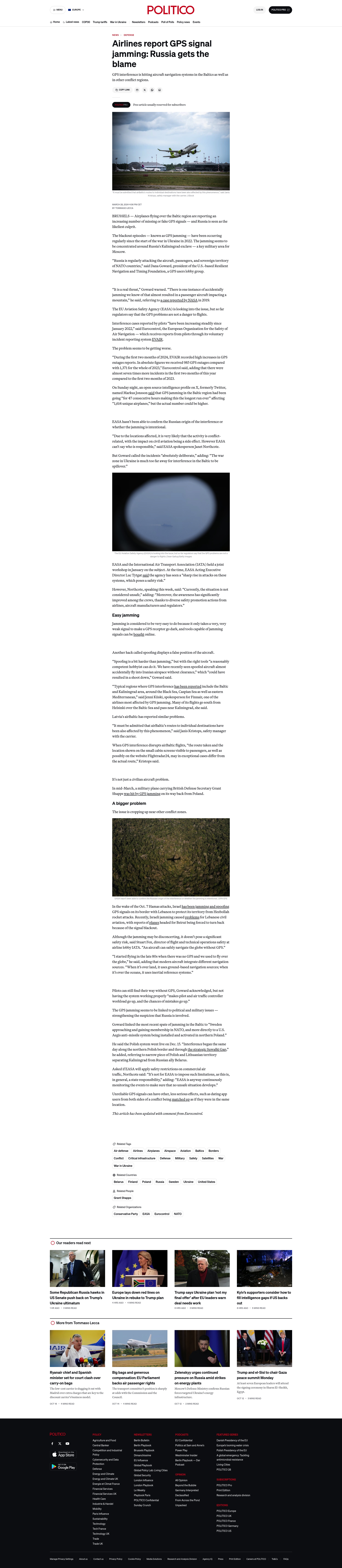 - "Airlines flying over the Baltic region have reported repeated problems with GPS navigation systems, believed to be caused by jamming signals emanating from Russian territory."