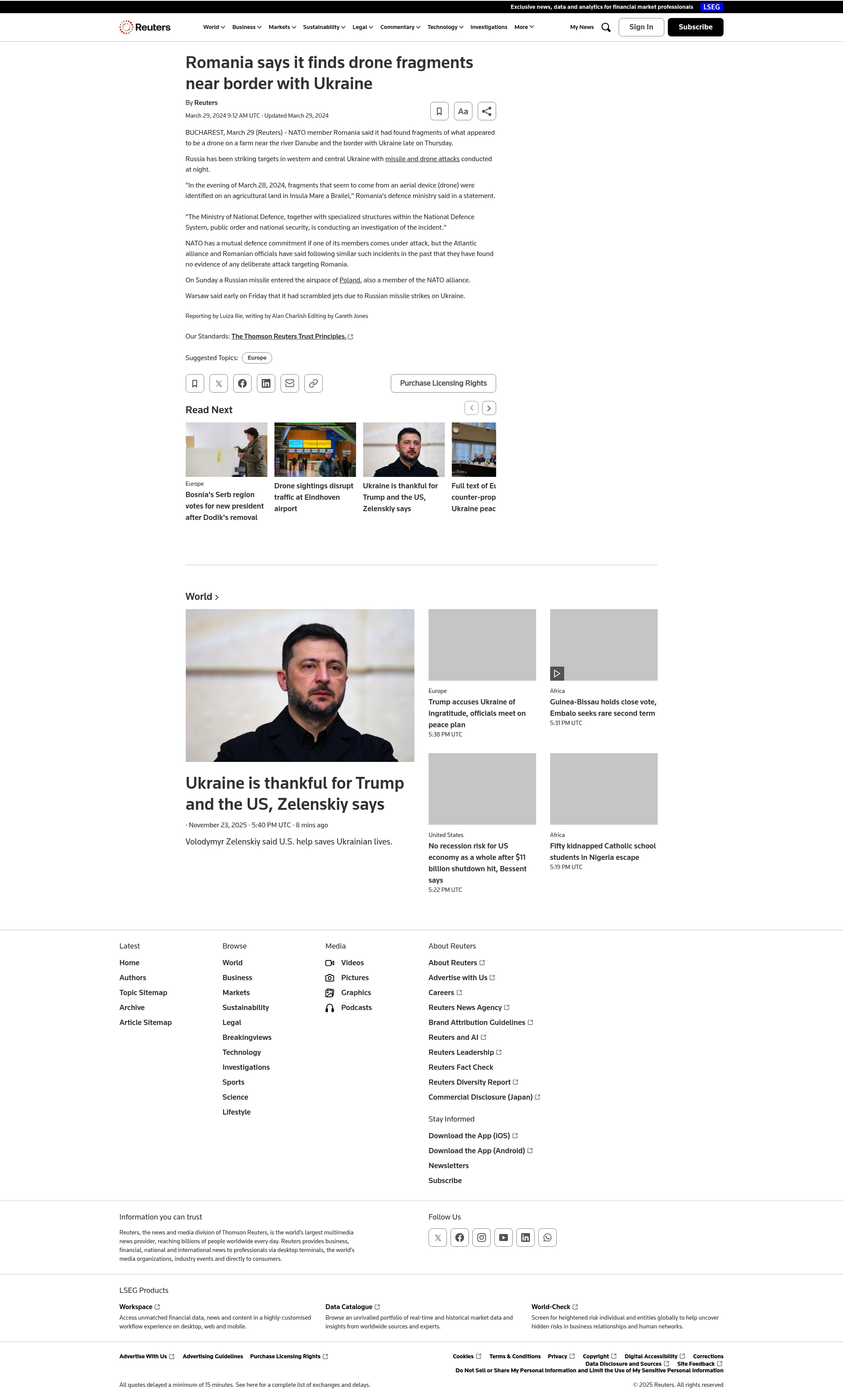 - "NATO member Romania said it had found fragments of what appeared to be a drone on a farm near the river Danube and the border with Ukraine late on Thursday."