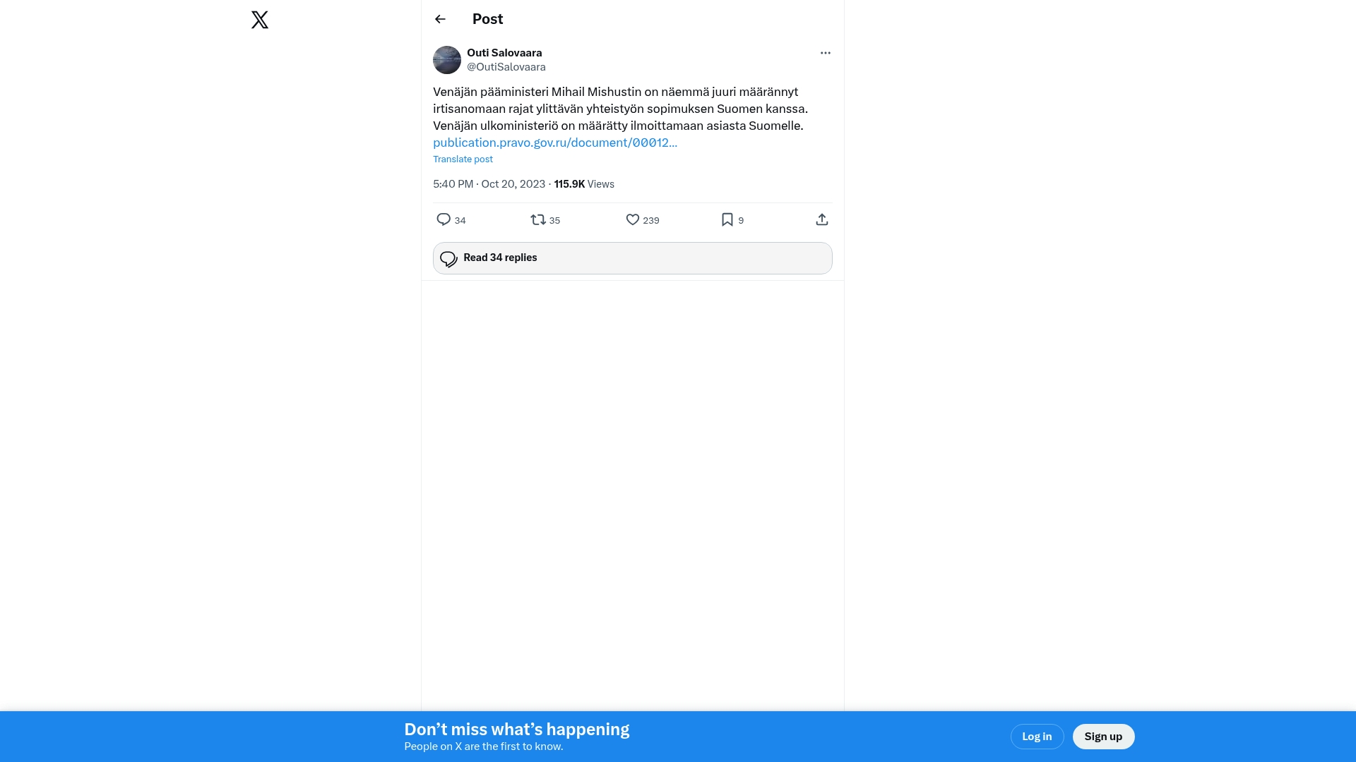 - "Venäjän pääministeri Mihail Mishustin on näemmä juuri määrännyt irtisanomaan rajat ylittävän yhteistyön sopimuksen Suomen kanssa. Venäjän ulkoministeriö on määrätty ilmoittamaan asiasta Suomelle."