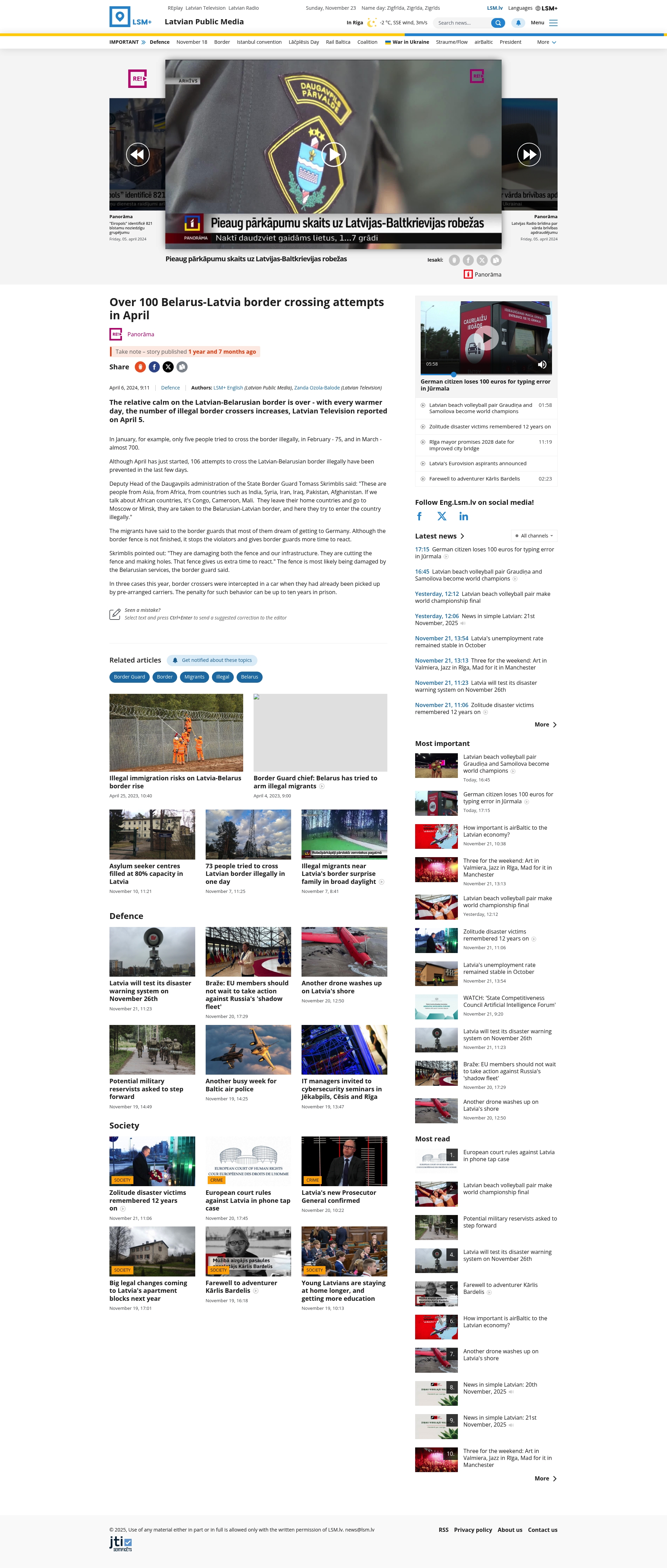 - ""The relative calm on the Latvian-Belarussian border is over – with every warmer day, the number of illegal border crossers increases, Latvian Television reported on April 5.""