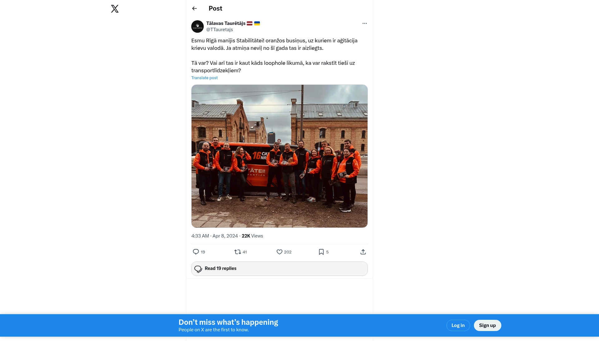 A report from Riga, Latvia, documents orange minibuses used by the political party 'Stabilitātei!' featuring Russian-language campaigning, which is suggested to be banned since 9 May of a previous year. The post questions if this is allowed or if a legal loophole is being exploited, specifically regarding advertising on vehicles.