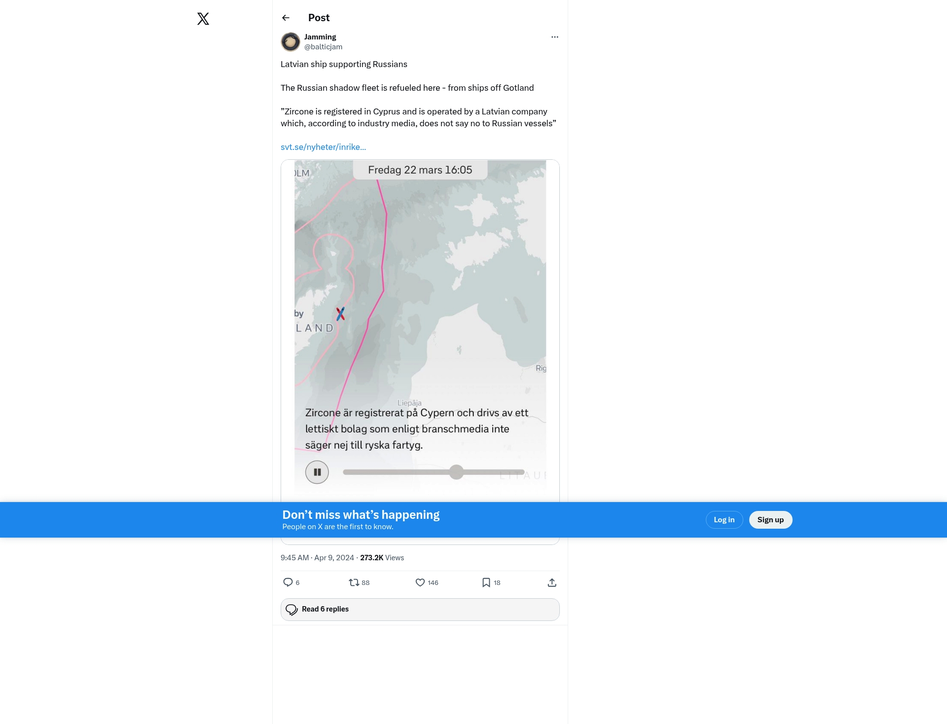 A post claims that the Russian shadow fleet is being refueled by a Latvian-operated vessel off Gotland, Sweden. The ship 'Zircone' is registered in Cyprus and managed by a Latvian company reportedly not refusing Russian vessels. Evidence includes a map and Swedish media reference.