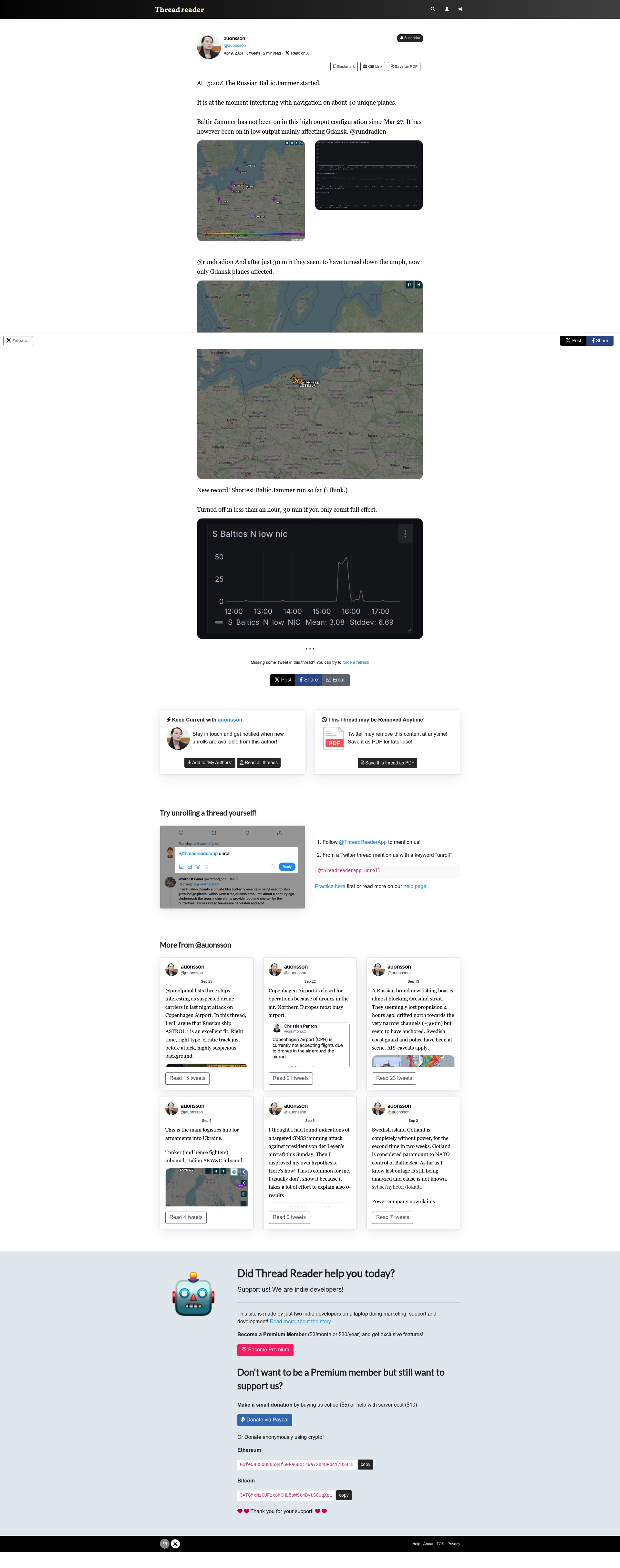 "description": "At 15:20Z The ?? Russian Baltic Jammer started. It is at the moment interfering with navigation on about 40 unique planes. Baltic Jammer has not been on in this high ouput configuration since Mar 27. It has however been on in low output mainly affecting Gdansk. shortest on-off ever.",