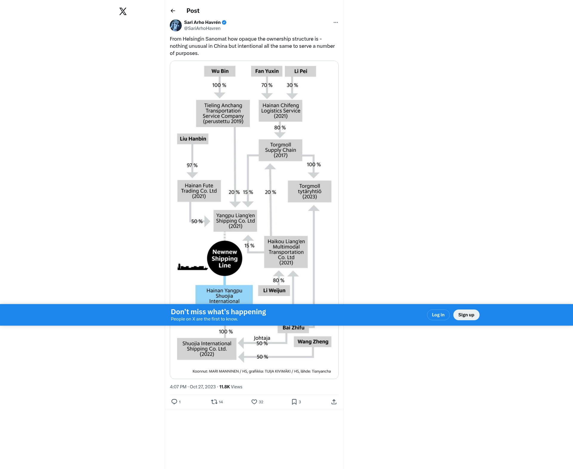 - "A Helsingin Sanomat flow chart showing companies: Wu Bin, Fan Yuxin, Li Pei, Newnew Shipping Line, Hainan Chifeng Logistics Service, Torgmoll Supply Chain, and others."