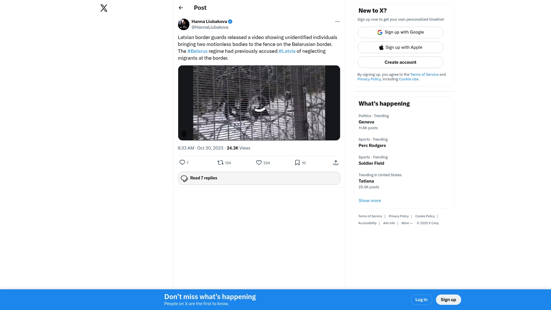 - "Latvian border guards released a video showing unidentified individuals bringing two motionless bodies to the fence on the Belarusian border."