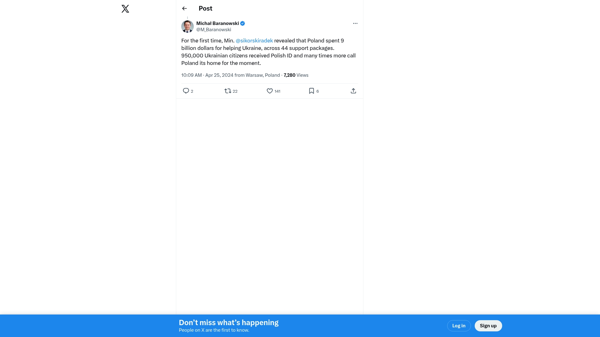 - "For the first time, Min. @sikorskiradek revealed that Poland spent 9 billion dollars for helping Ukraine, across 44 support packages."