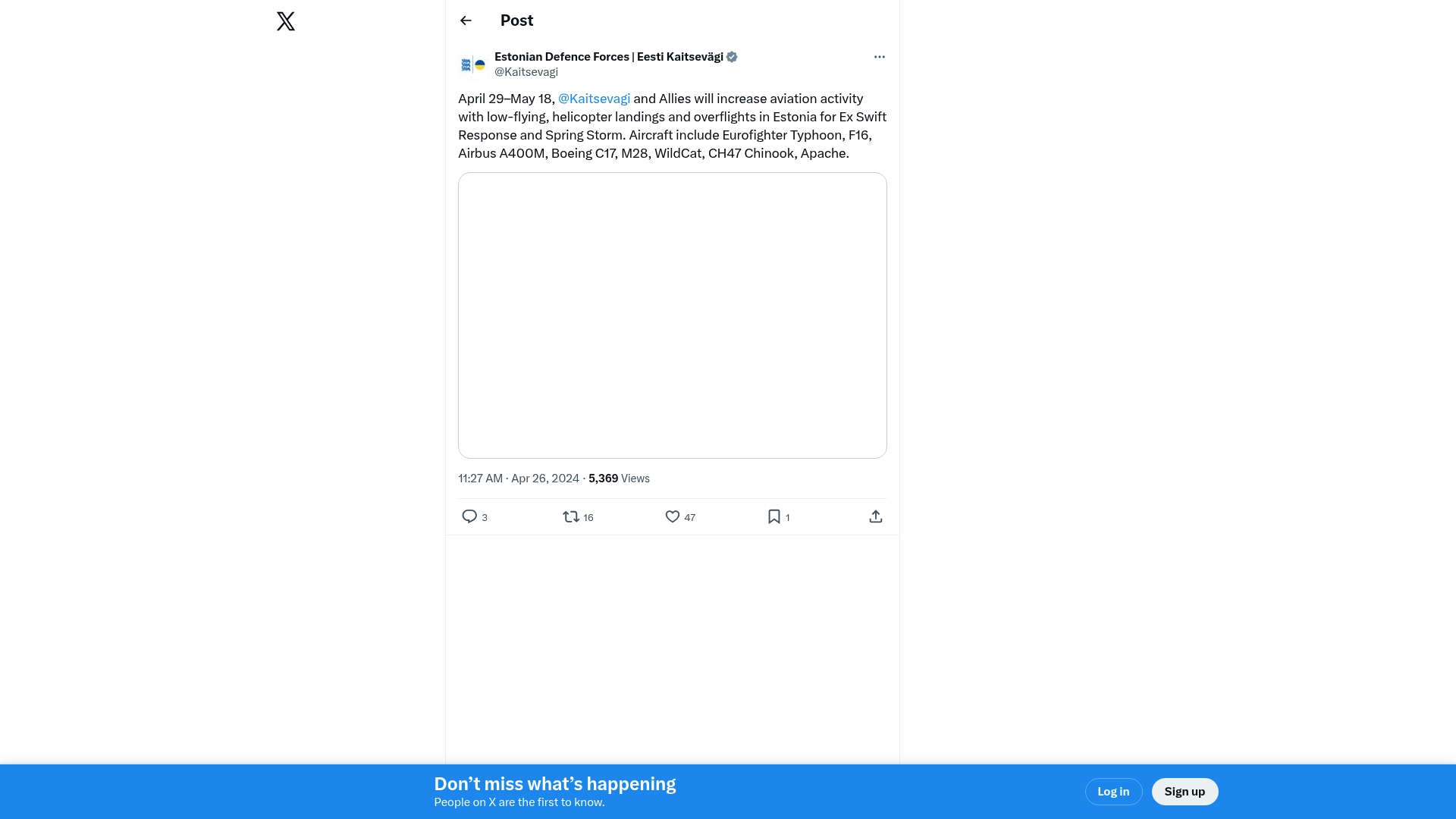 - "April 29–May 18, @Kaitsevagi and Allies will increase aviation activity with low-flying, helicopter landings and overflights in Estonia for Ex Swift Response and Spring Storm."