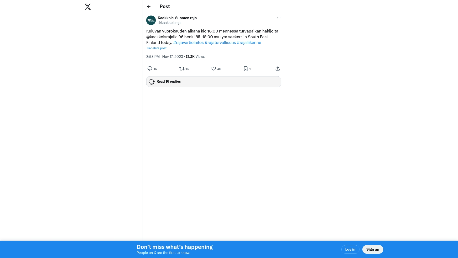 - "Kuluvan vuorokauden aikana klo 18:00 mennessä turvapaikan hakijoita @kaakkoisrajalla 96 henkilöä."
