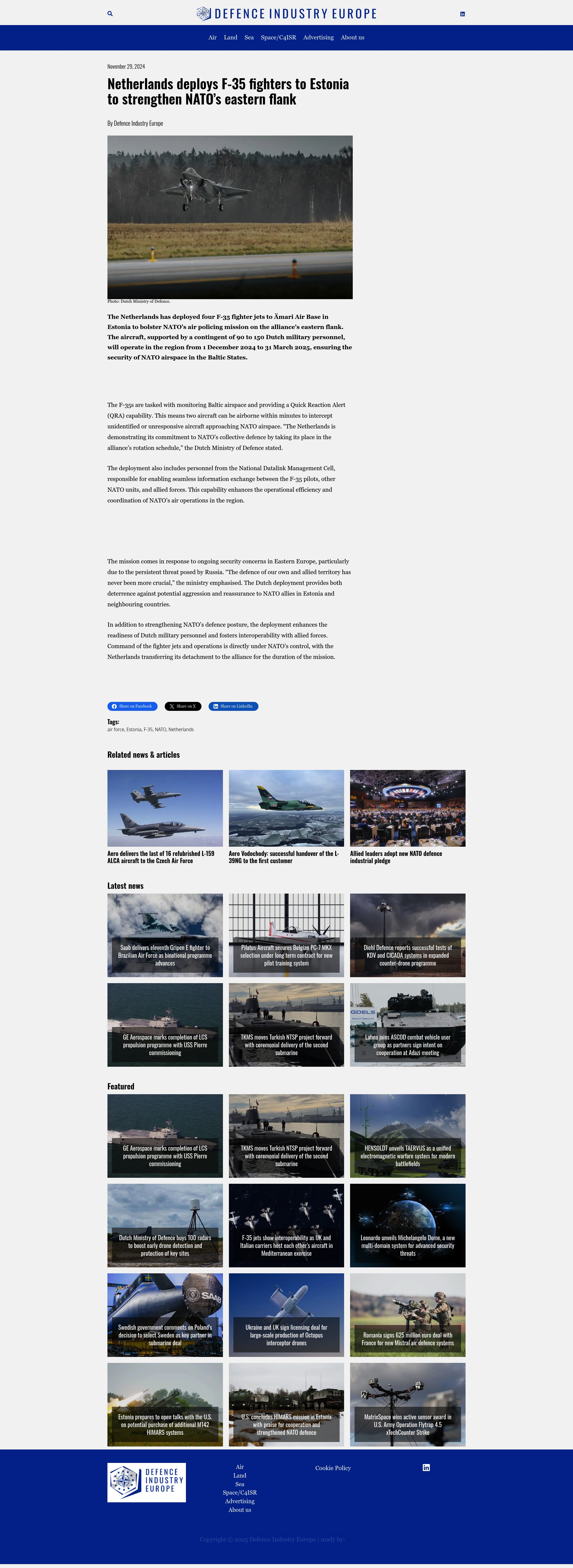 The Netherlands has deployed four F-35 fighter jets to Ämari Air Base in Estonia to bolster NATO's air policing mission on its eastern flank. The deployment, from December 1, 2024, to March 31, 2025, includes 90 to 150 Dutch military personnel and aims to ensure the security of NATO airspace in the Baltic States. The fighters provide Quick Reaction Alert capability to intercept unidentified or unresponsive aircraft approaching NATO airspace, demonstrating Dutch commitment to NATO collective defense. The deployment also features personnel from the National Italink Management Cell to facilitate coordination among NATO operations. This mission responds to ongoing security concerns in Eastern Europe due to the persistent threat posed by Russia, offering deterrence and reassurance to NATO allies in Estonia and neighboring countries.