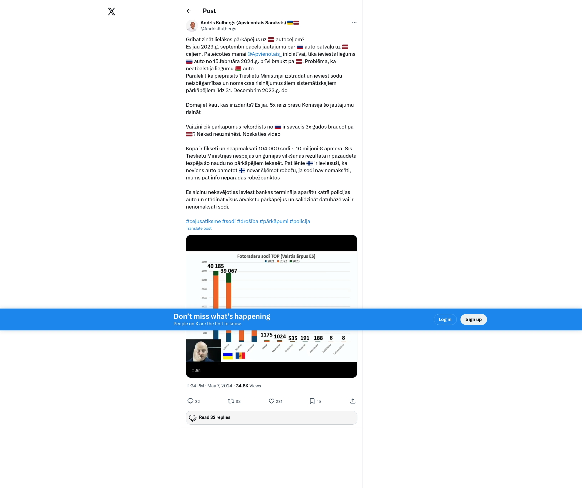 The post discusses the issue of unpaid traffic fines by vehicles from non-EU countries, particularly from Russia and Belarus, on Latvian roads. It highlights the introduction of a new law in Latvia as of February 15, 2024, that allows free passage but points out the problem that fines are not enforced. Statistics mention unpaid fines totaling up to 10 million euros, and about 40,000 recorded violations. The poster urges installing payment terminals at police checkpoints and syncing fines in a common database to ensure they are paid before vehicles leave Latvia.