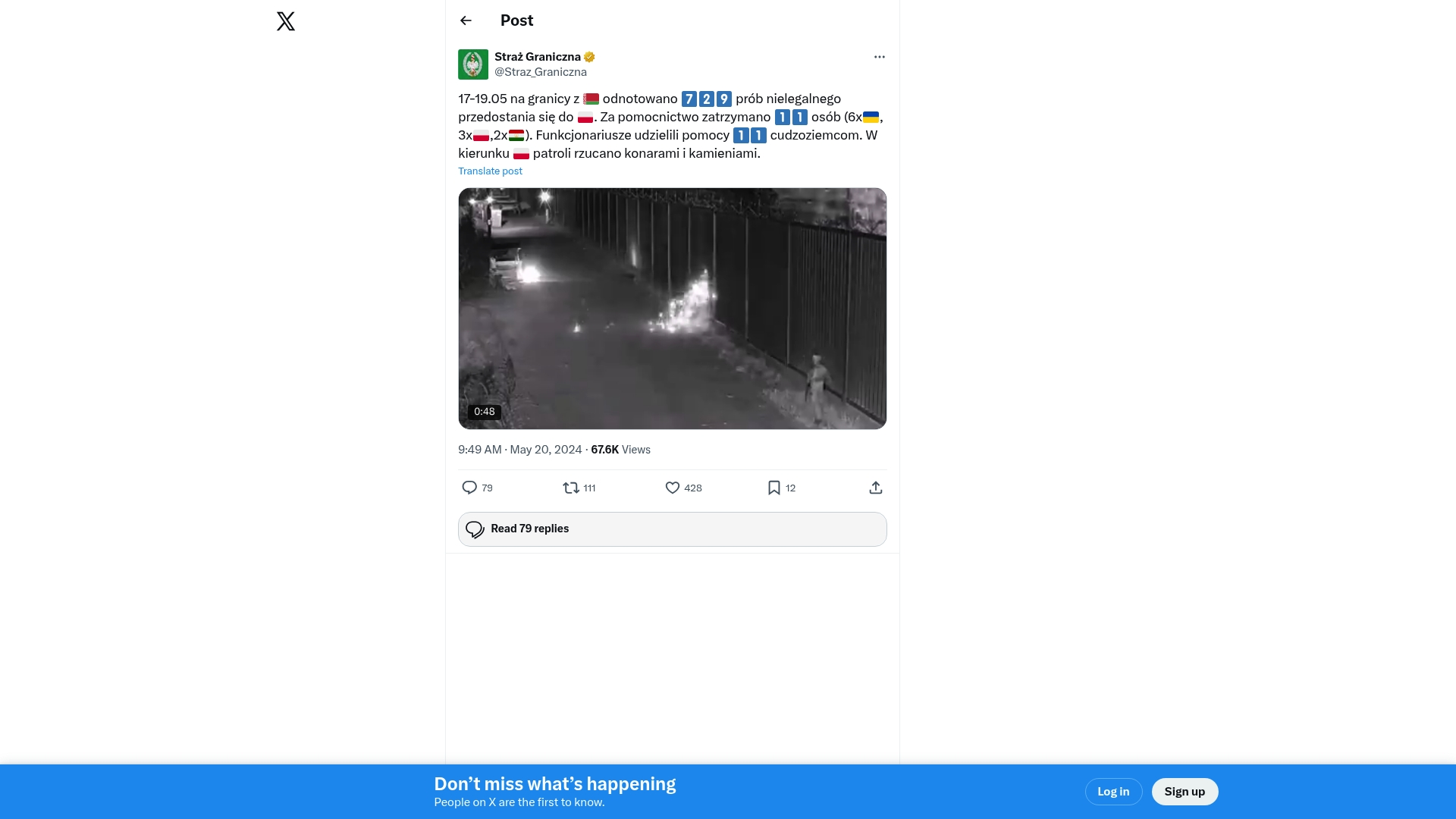 Between May 17 and 19, 2024, Polish Border Guard reported 729 attempted illegal crossings at the Polish-Belarusian border. 11 individuals assisting with illegal crossings were detained (mainly from Ukraine and Belarus). Foreign nationals in need received assistance. Patrols in the direction of Belarus faced objects (branches, stones) thrown at them.
