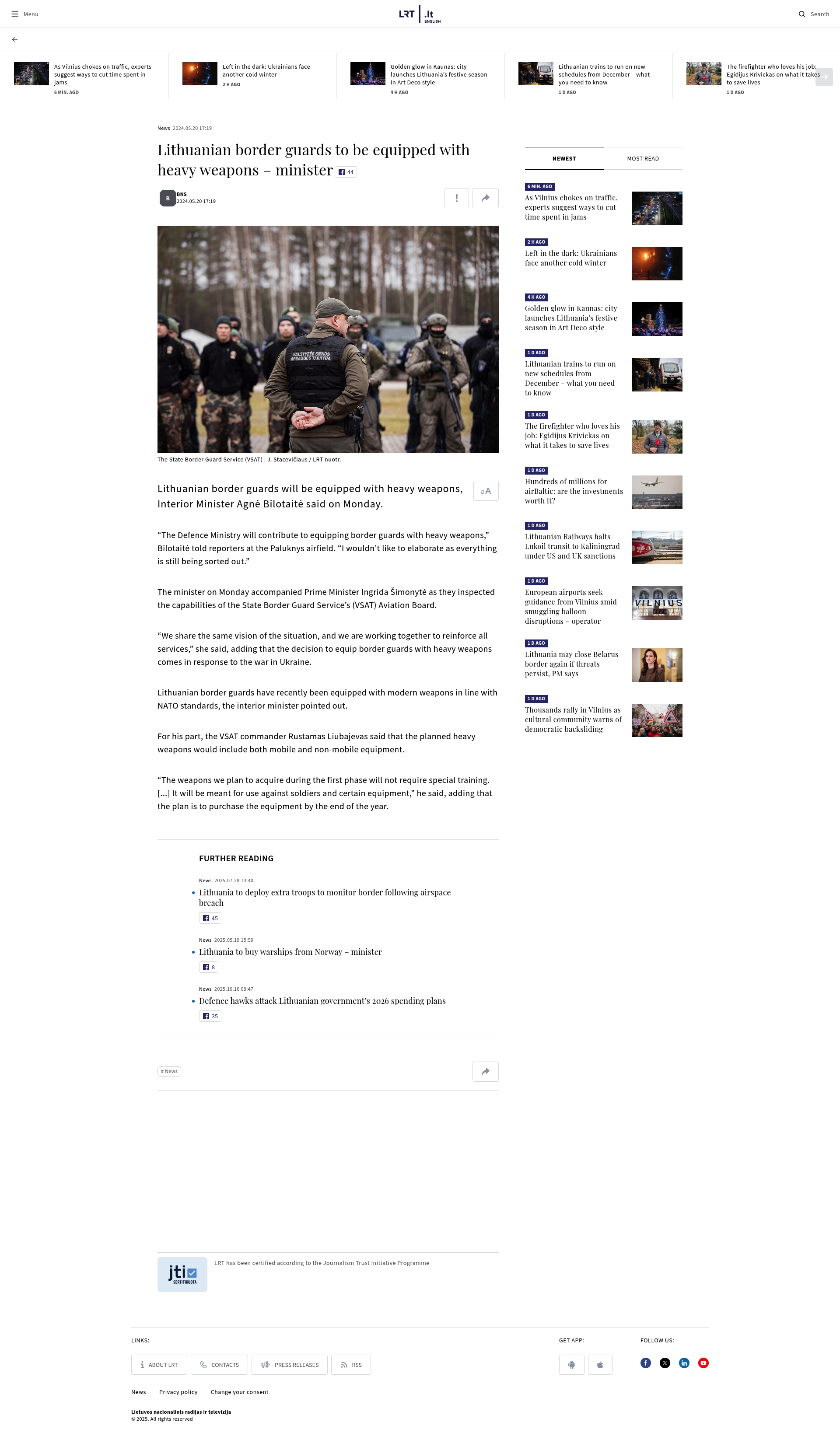 - "Lithuanian border guards will be equipped with heavy weapons, Interior Minister Agnė Bilotaitė said on Monday."