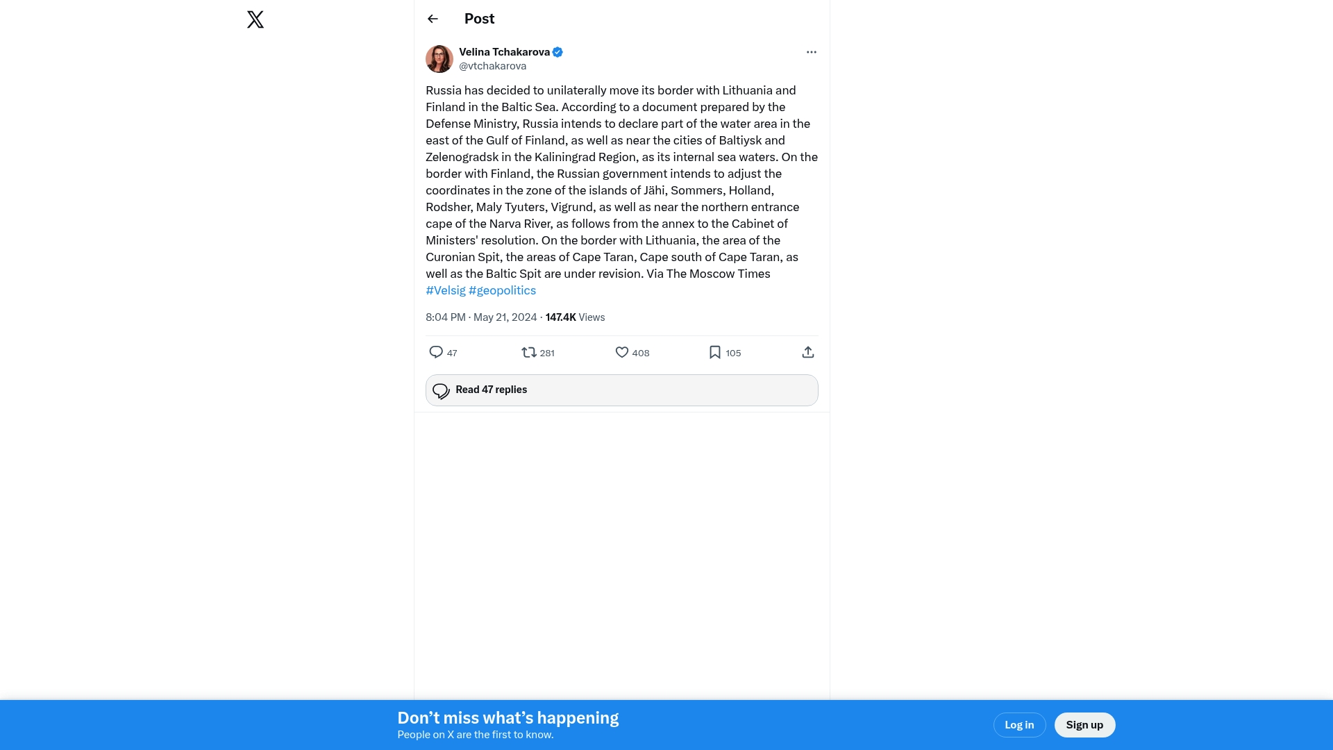 - "Russia has decided to unilaterally move its border with Lithuania and Finland in the Baltic Sea. According to a document prepared by the Defense Ministry, Russia intends to declare part of the water a..."
