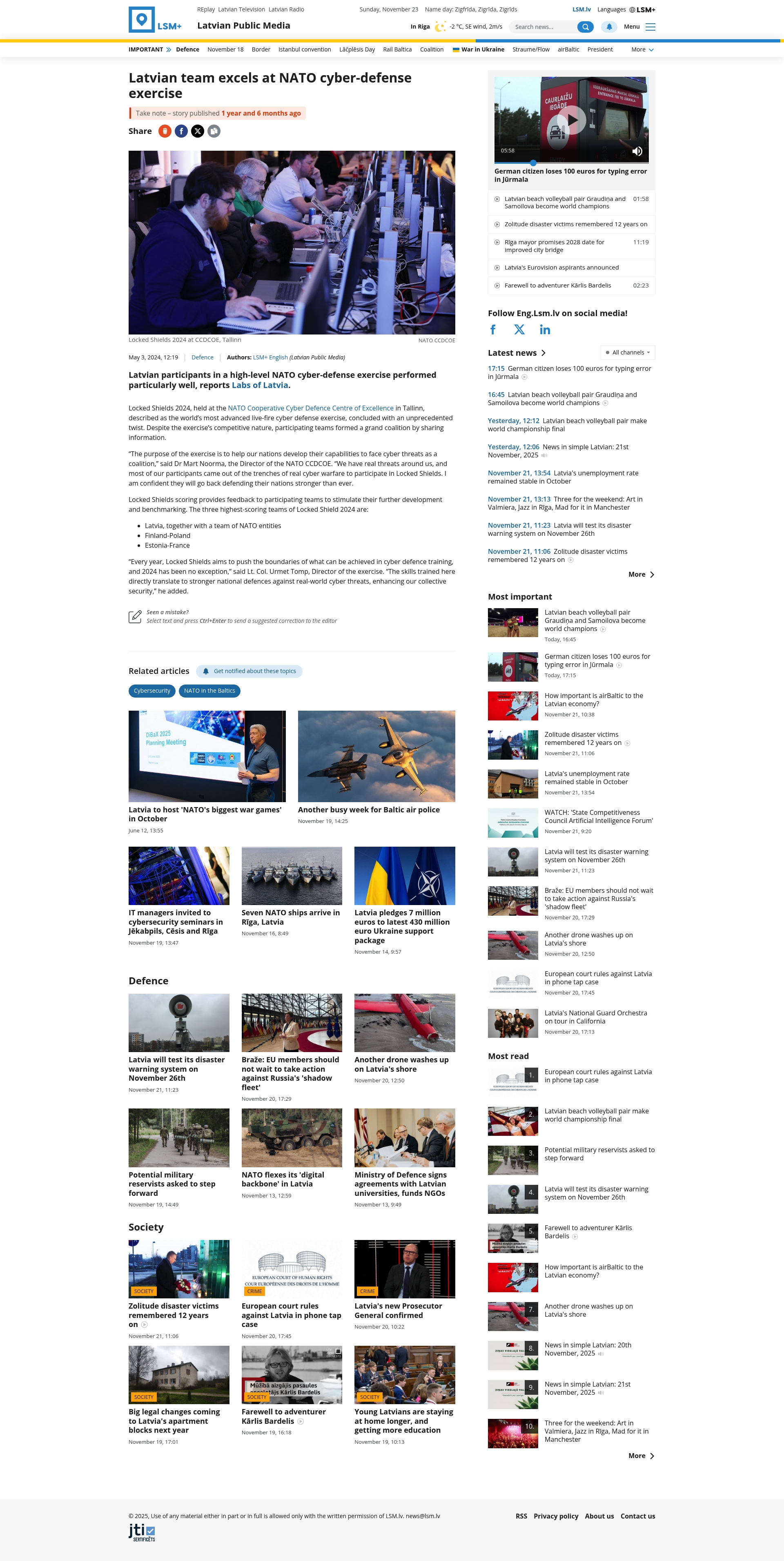 "description": "Latvian participants excelled at the high-level NATO Locked Shields 2024 cyber-defense exercise, held at the NATO Cooperative Cyber Defence Centre of Excellence in Tallinn, demonstrating advanced cyber defense capabilities alongside teams from across NATO.",