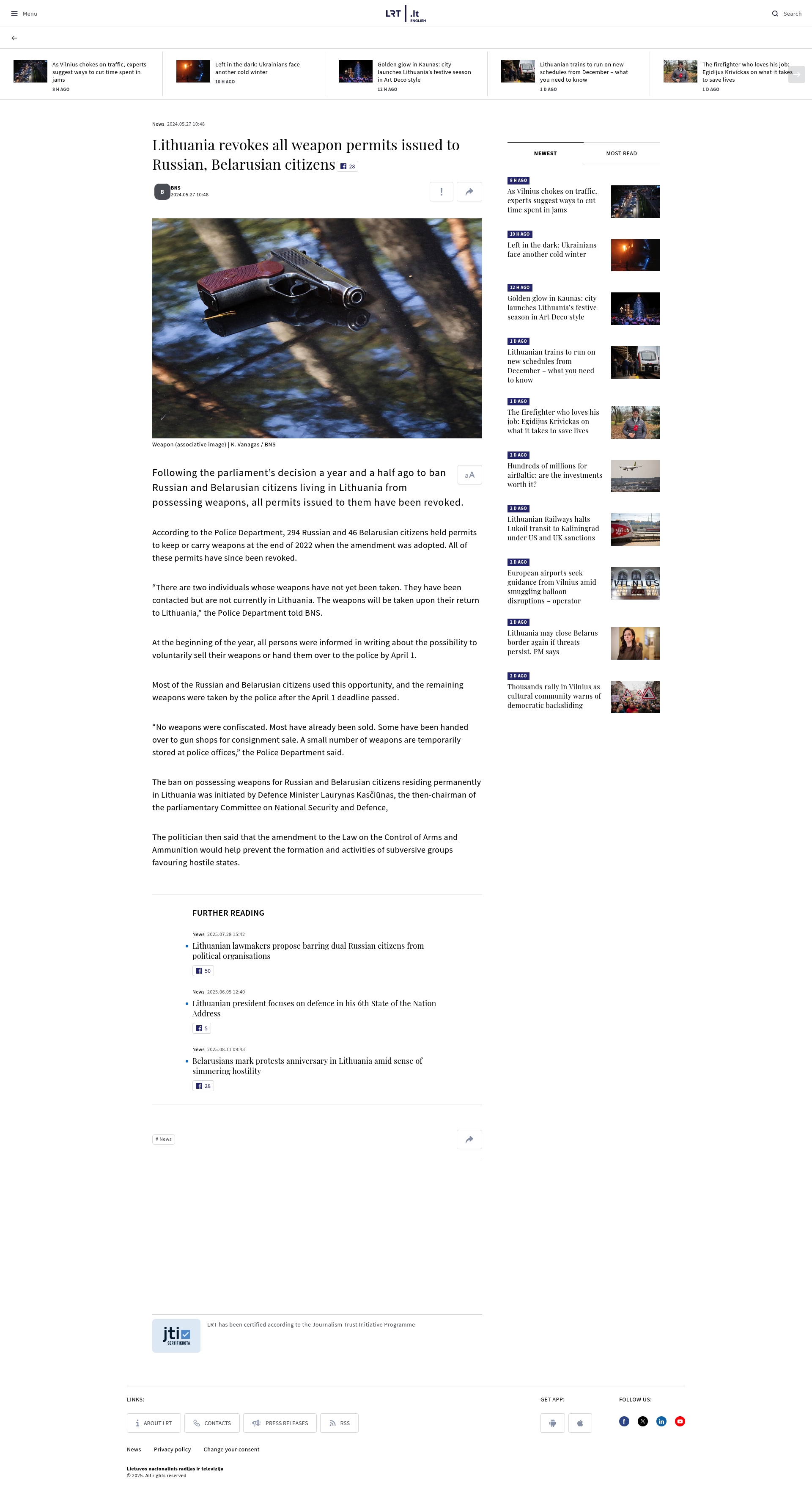 Headline: Lithuania revokes all weapon permits issued to Russian, Belarusian citizens