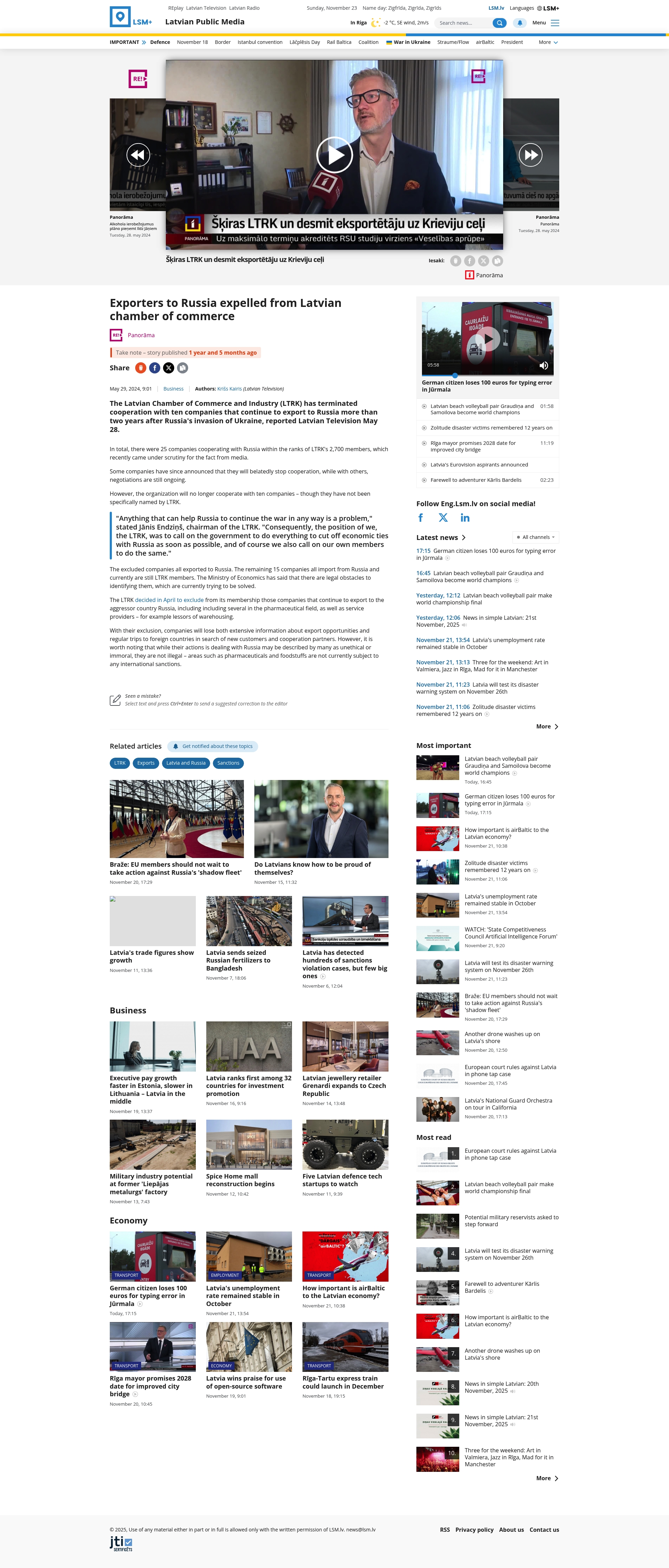 "title": "??Latvia expels exporters to Russia from chamber of commerce. The Latvian Chamber of Commerce and Industry (LTRK) has terminated cooperation with ten companies that continue to export to Russia more than two years after Russia's invasion of Ukraine, reported Latvian Television May 28."