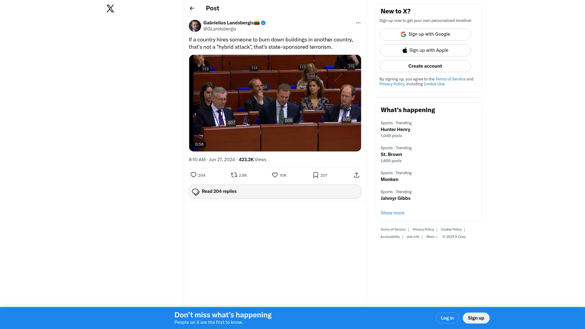 Lithuanian official publicly states that when a country hires someone to burn down buildings in another country, it should be classified as state-sponsored terrorism, not merely a 'hybrid attack.' The post is a high-profile denouncement of recent cross-border actions linked to state-backed sabotage.