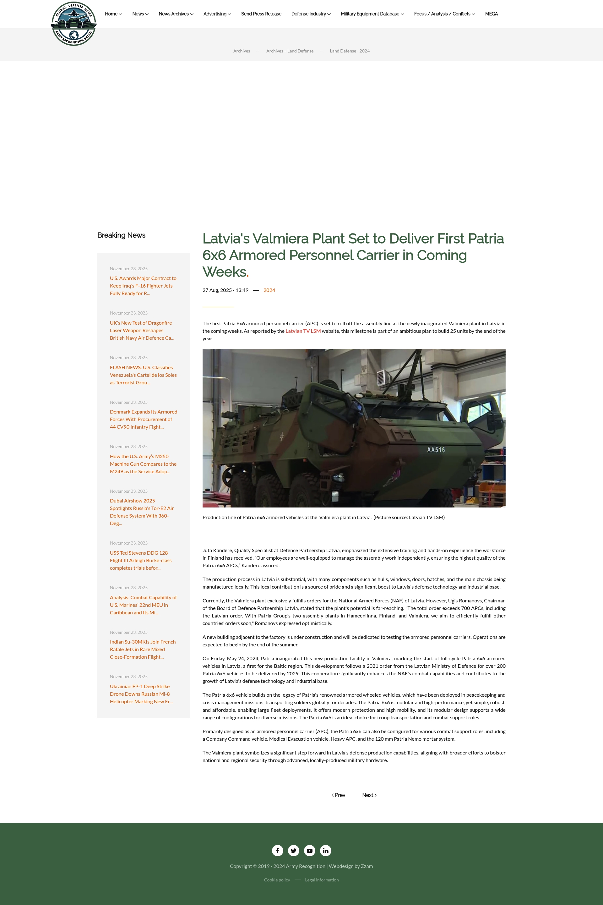"description": "Latvia's Valmiera plant is set to deliver the first Patria 6x6 armored personnel carrier (APC) in the coming weeks, as part of an extensive defense production initiative. The facility has been newly inaugurated and will build 25 units by the end of the year, supporting orders for the Latvian National Armed Forces and broader regional defense cooperation.",
