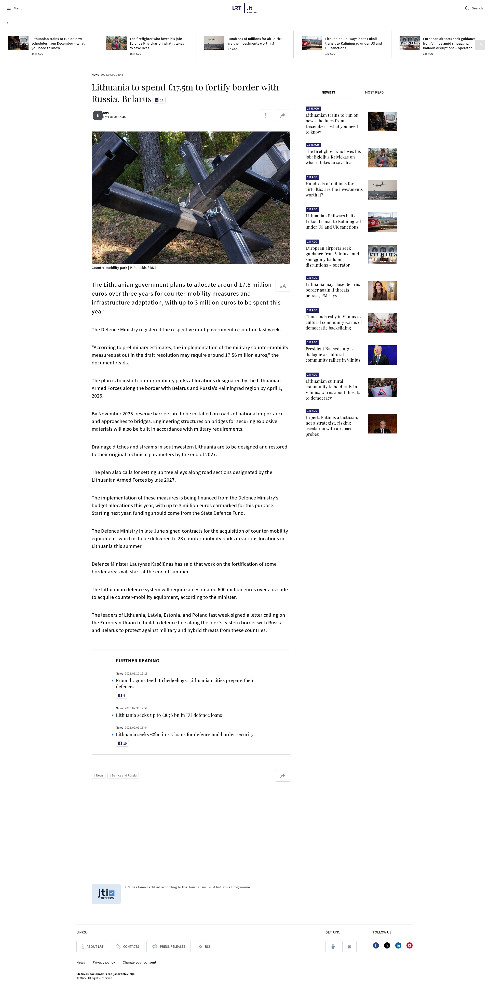 Headline: Lithuania to spend €17.5m to fortify border with Russia, Belarus