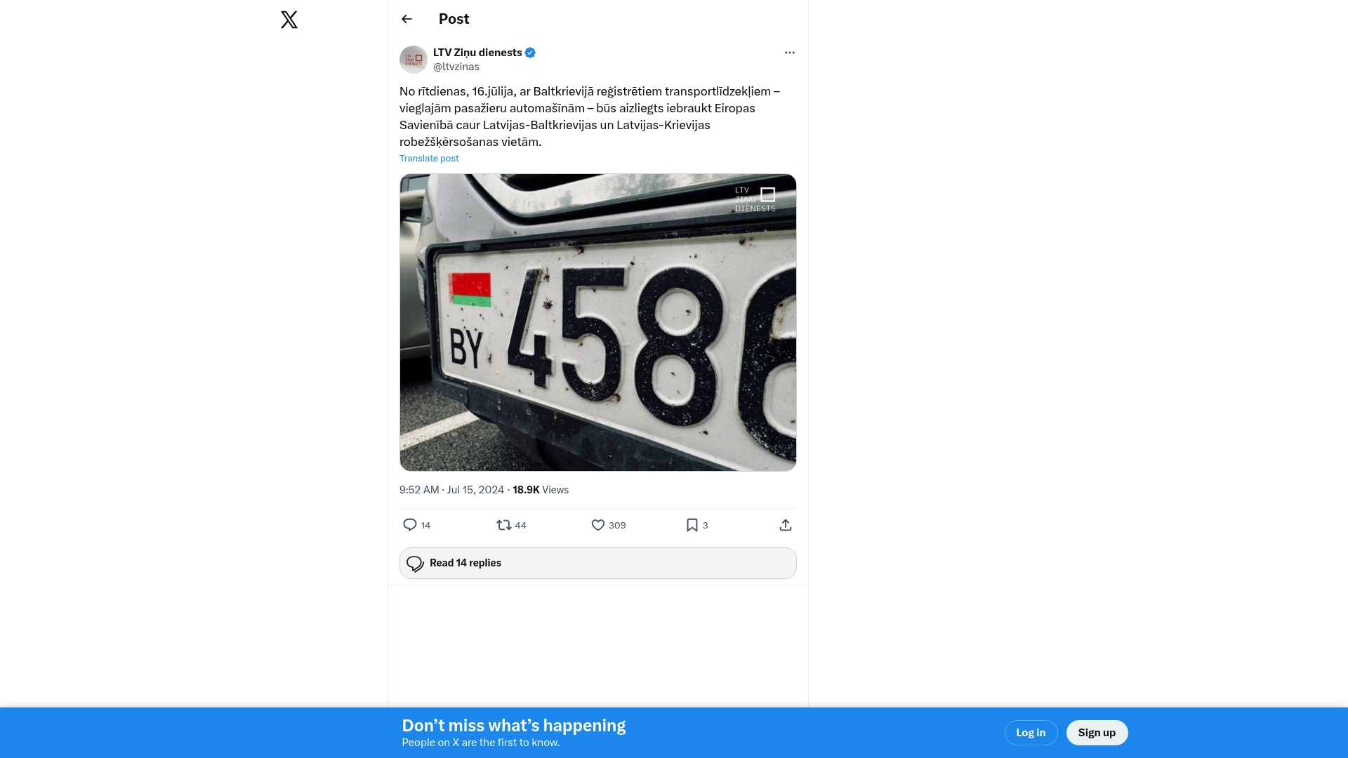 - "No rītdienas, 16. jūlijā, ar Baltkrievijā reģistrētiem transportlīdzekļiem – vieglajām pasažieru automašīnām – būs aizliegts iebraukt Eiropas Savienībā caur Latvijas-Baltkrievijas un Latvijas-Krievija..."