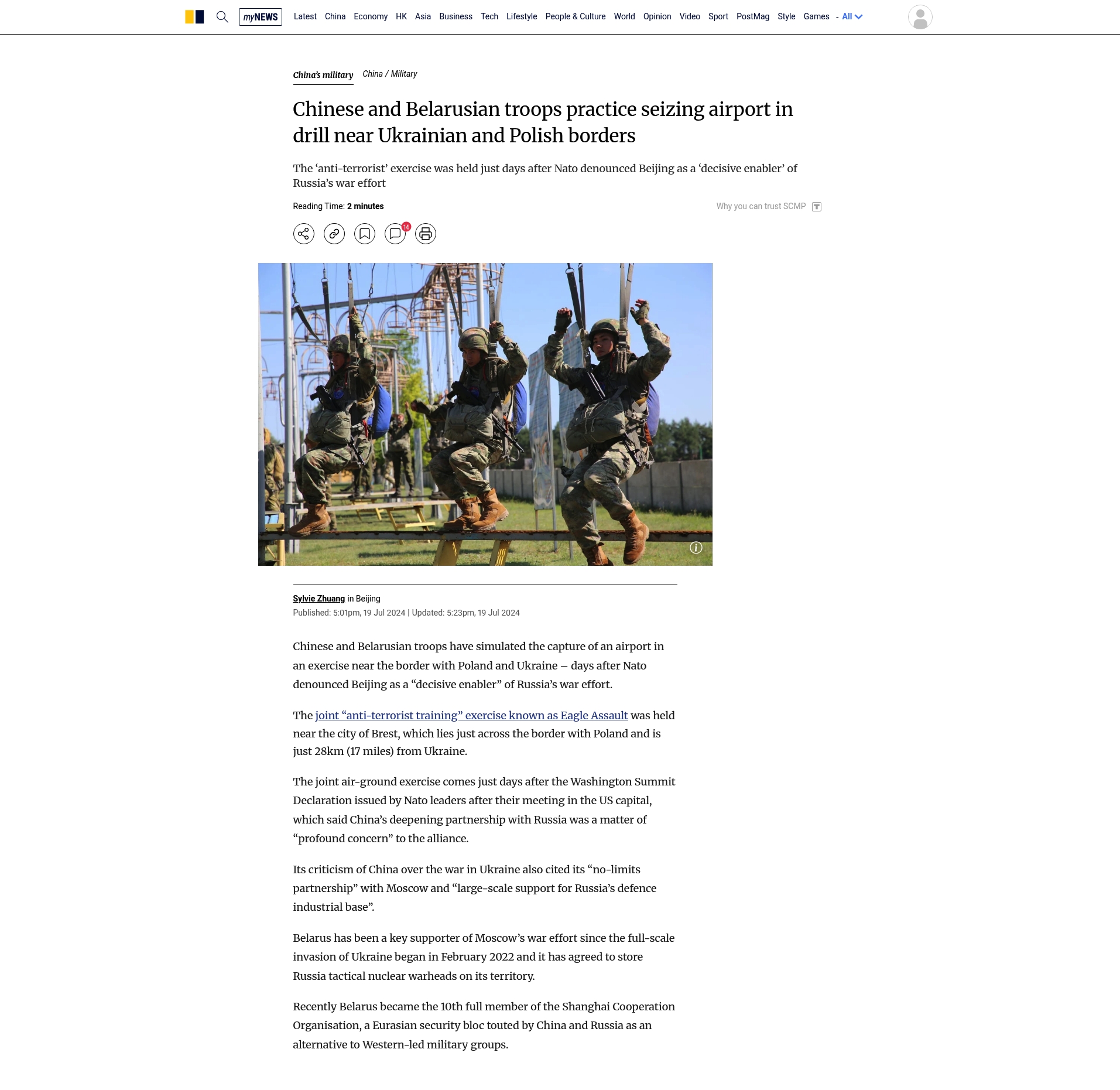 Headline: Chinese and Belarusian troops practice seizing airport in drill near Ukrainian and Polish borders
