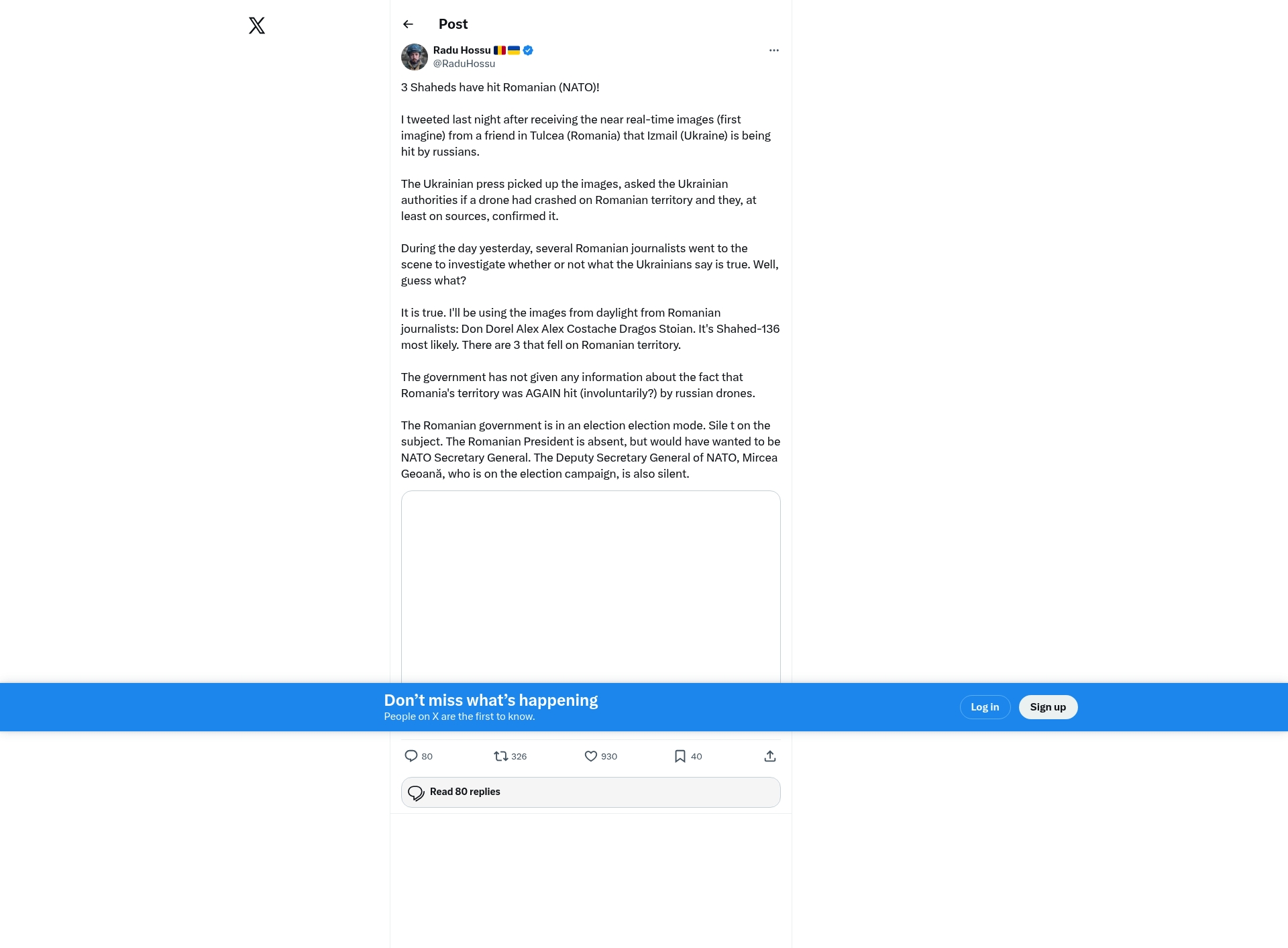 - "The government has not given any information about the fact that Romania's territory was AGAIN hit (involuntarily?) by russian drones."