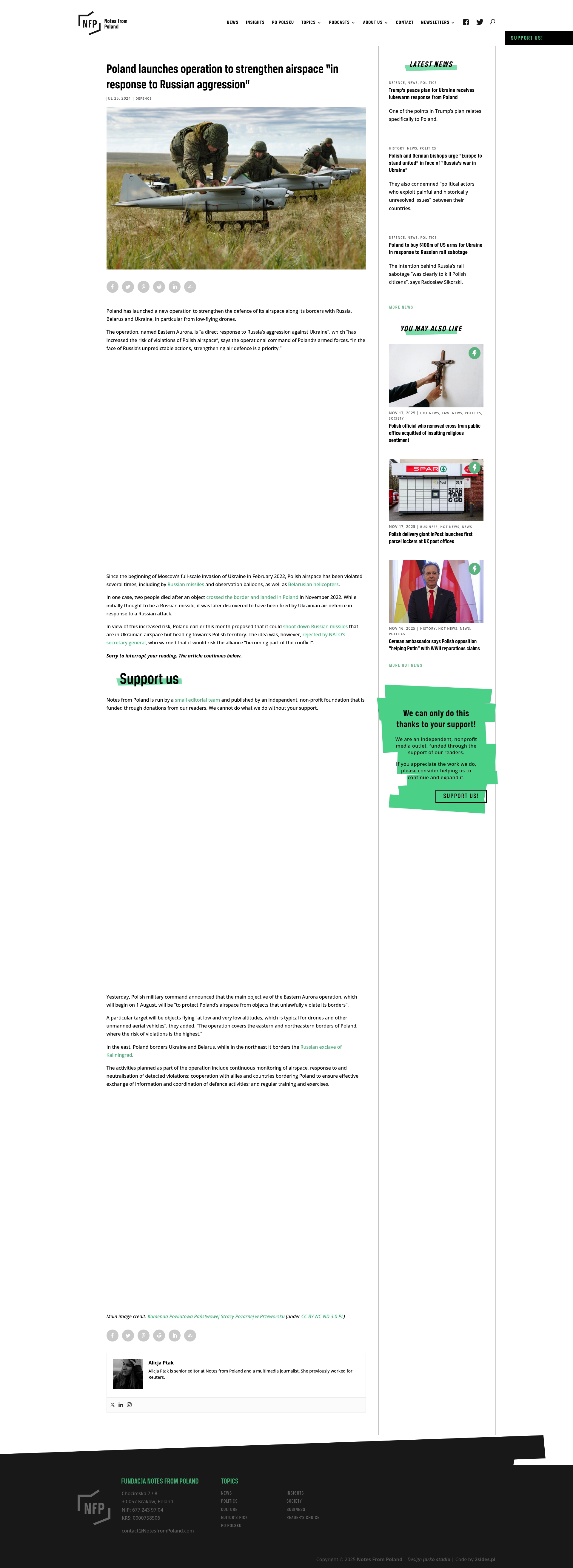 - "Poland has launched a new operation to strengthen the defence of its airspace along its borders with Russia, Belarus and Ukraine, in particular from low-flying drones."