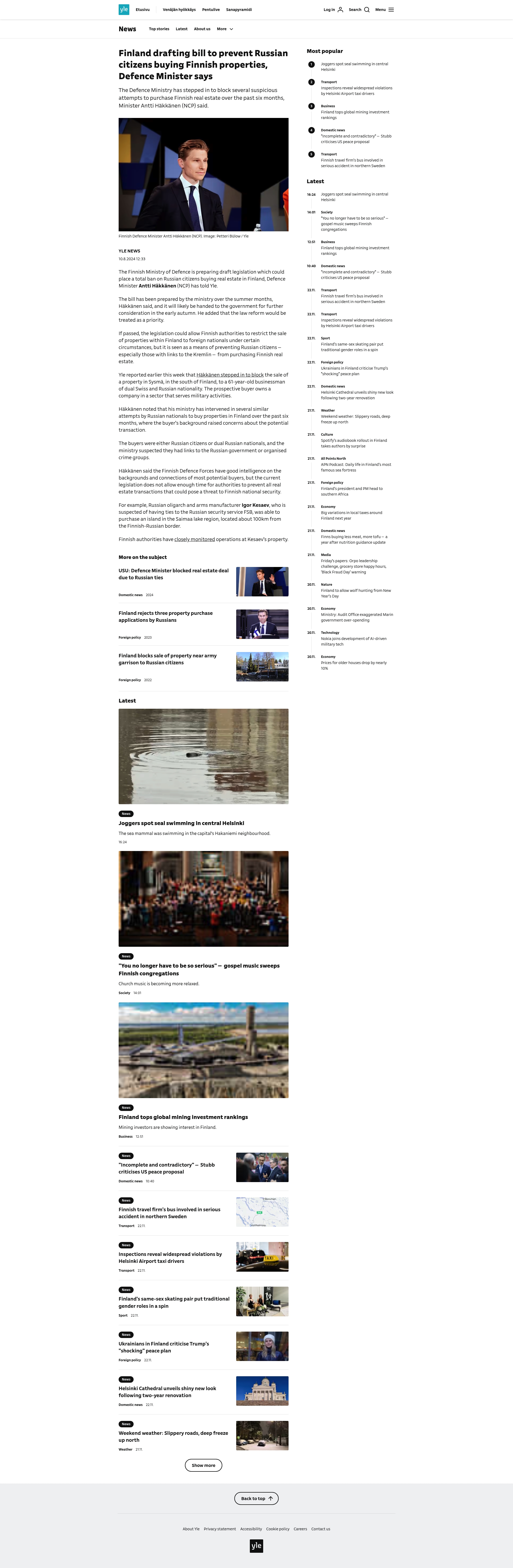 "Häkkänen noted that the ministry has intervened in several similar attempts by Russian nationals to buy properties in Finland over the past six months, where the buyer's background raised concerns abo...""Häkkänen noted that the ministry has intervened in several similar attempts by Russian nationals to buy properties in Finland over the past six months, where the buyer's background raised concerns about the potential for subversion."