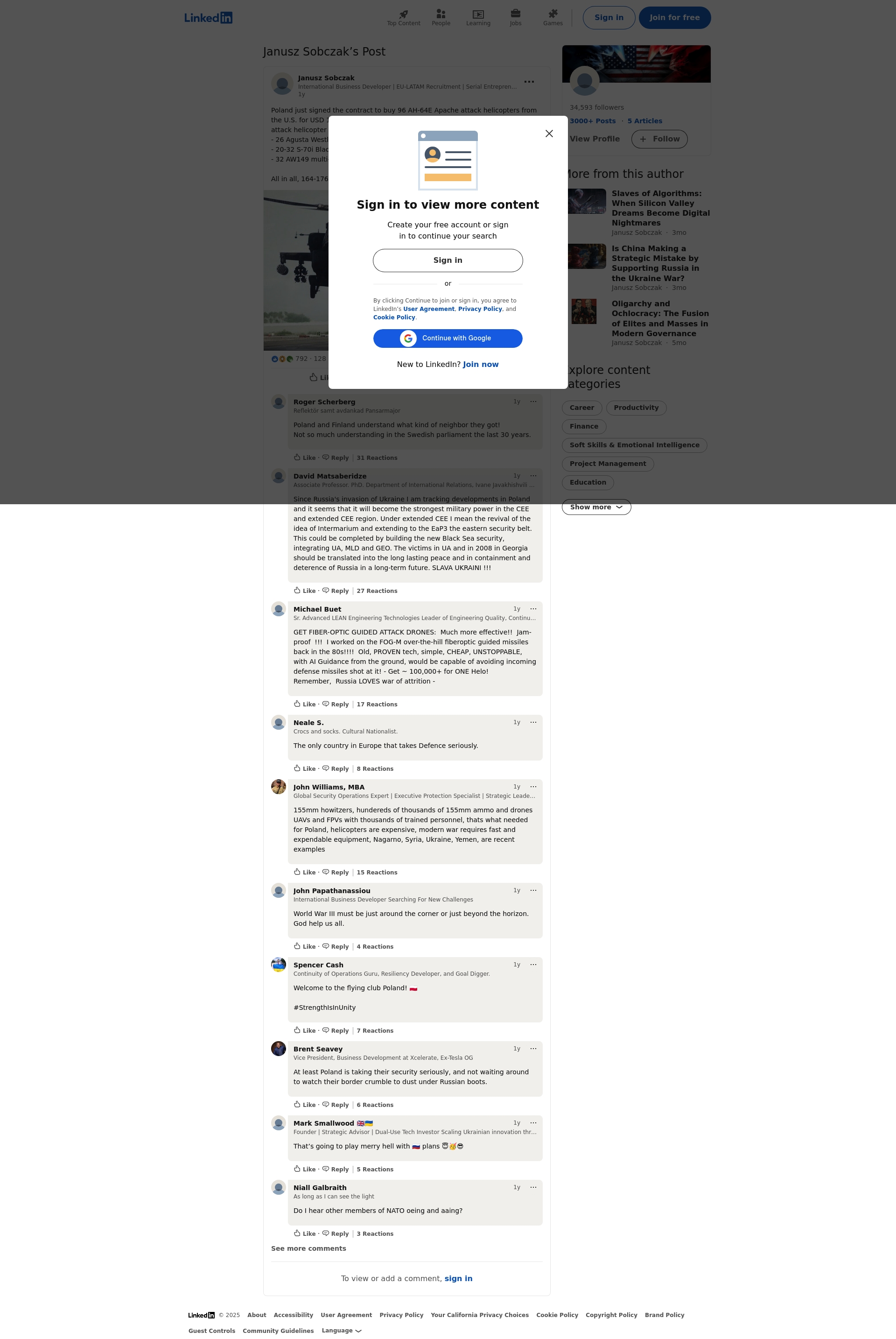 - "Poland just signed the contract to buy 96 AH-64E Apache attack helicopters from the U.S. for USD 10 billion."