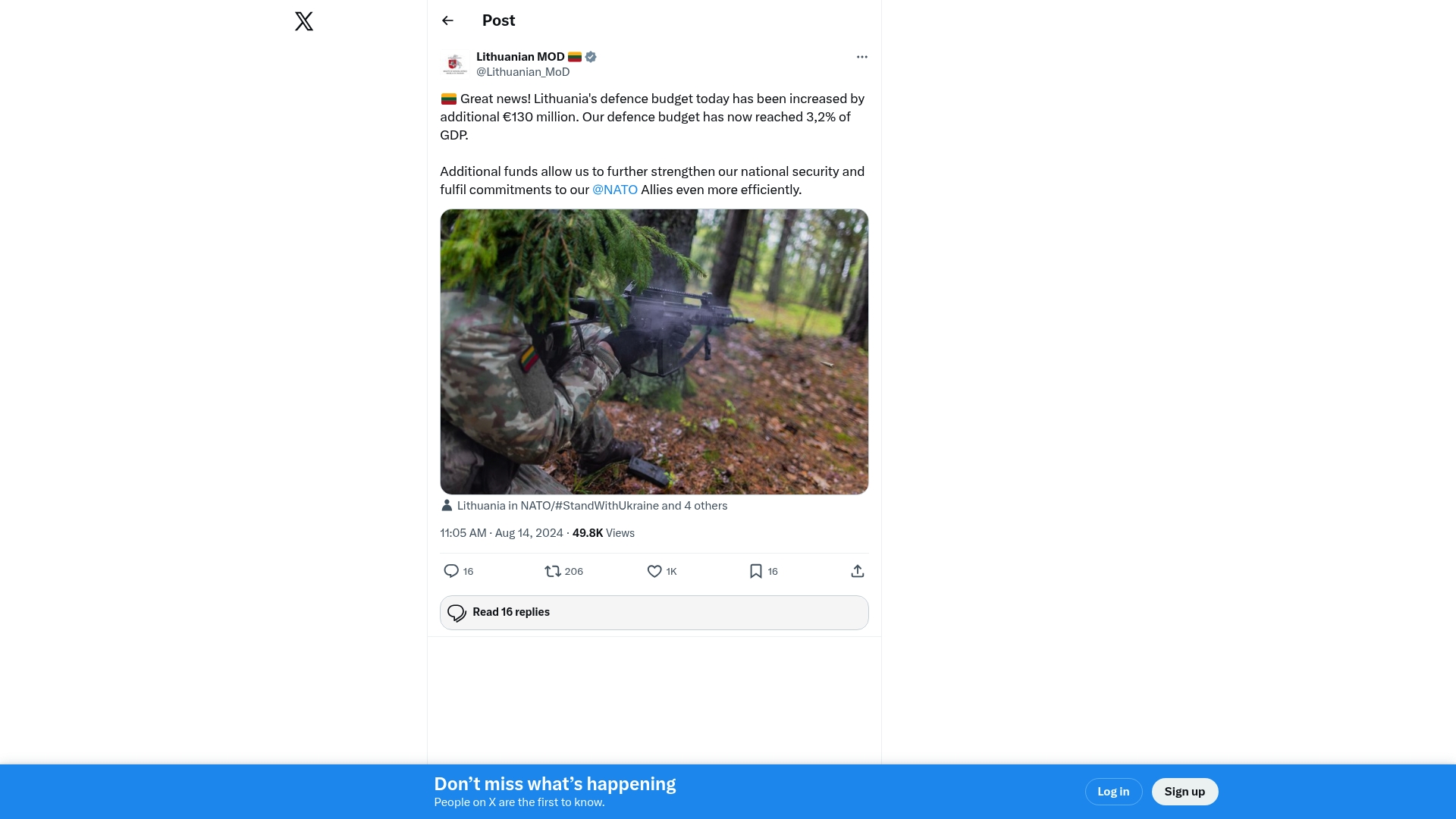 - "Great news! Lithuania's defence budget today has been increased by additional €130 million. Our defence budget has now reached 3,2% of GDP."