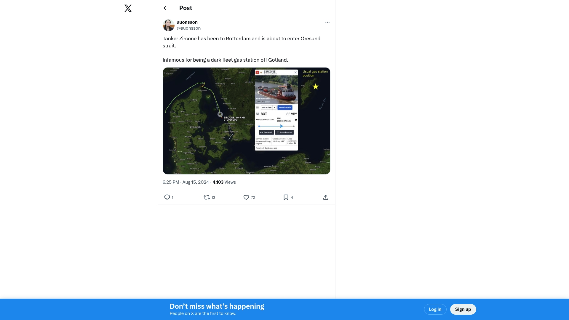 Headline: Tanker Zircone, infamous for 'dark fleet' activities off Gotland, nears Öresund after Rotterdam visit