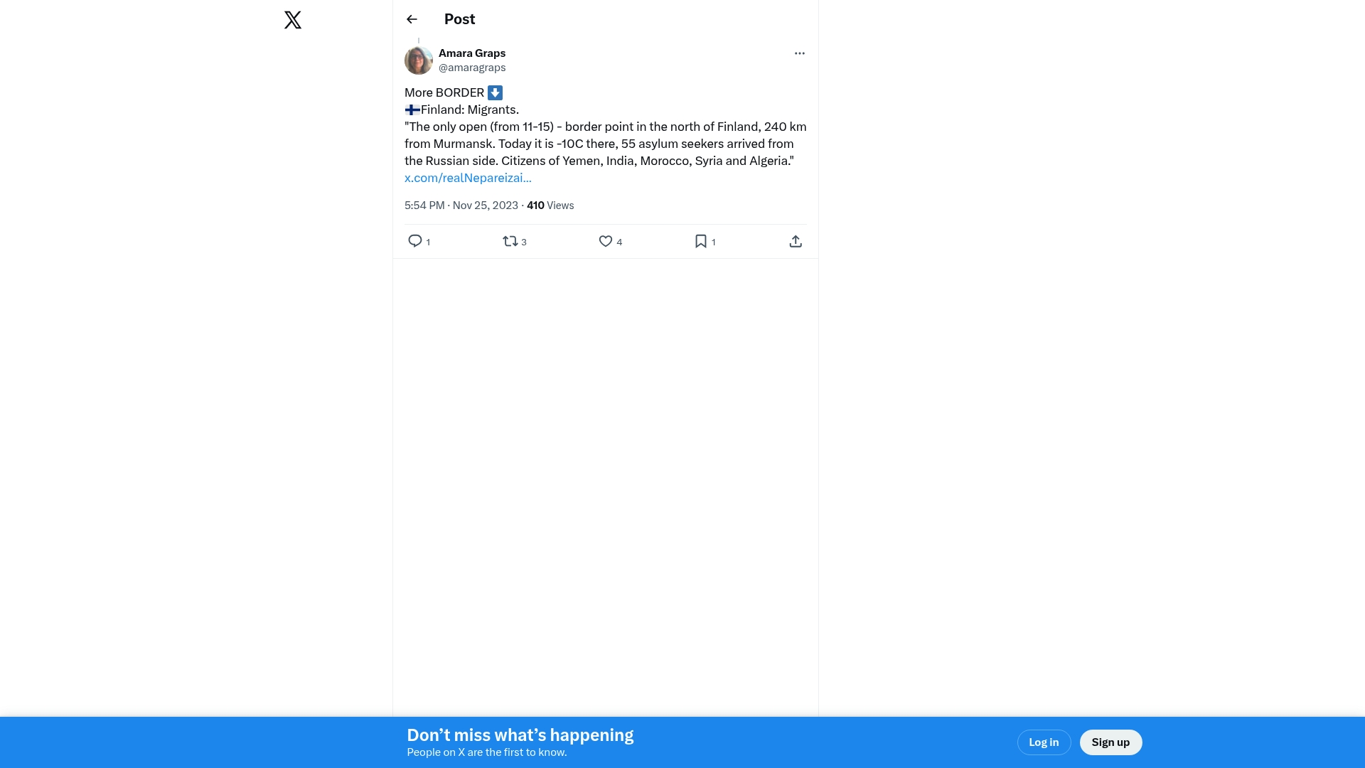 A social media report states that 55 asylum seekers arrived at the only open border point in the north of Finland (240 km from Murmansk), reportedly crossing from the Russian side in extreme cold conditions. The migrants are citizens of Yemen, India, Morocco, Syria, and Algeria.