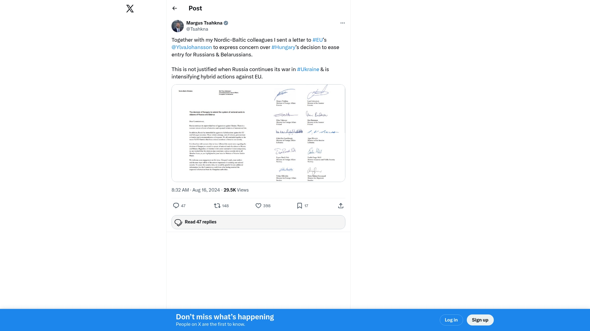 Notes: Nordic-Baltic letter to EU opposing Hungary easing entry for ?? Russians