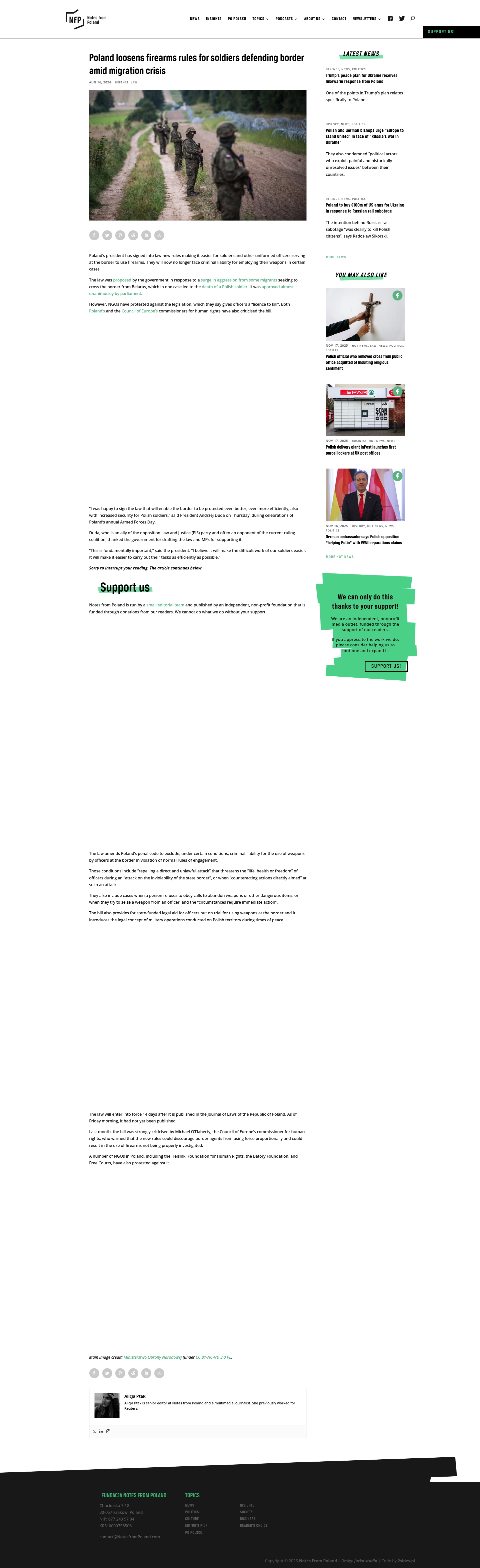 - "Poland has introduced legislation to loosen rules for soldiers’ use of firearms while defending the border amid a migration crisis."