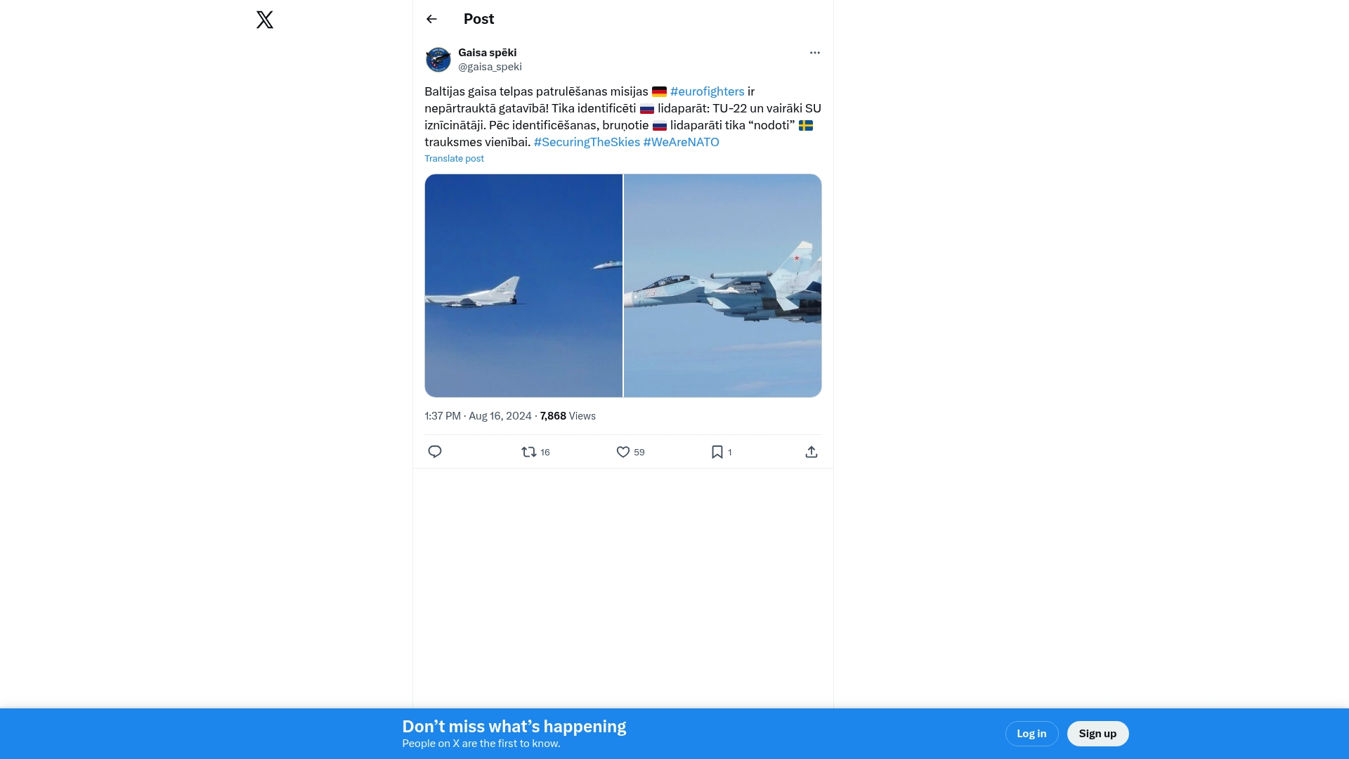 - "Baltijas gaisa telpas patrulēšanas misijas #eurofighters ir nepārtrauktā gatavībā! Tika identificēti lidaparāti: TU-22 un vairāki SU iznīcinātāji. Pēc identificēšanas, bruņotie lidaparāti tika 'nodoti..."