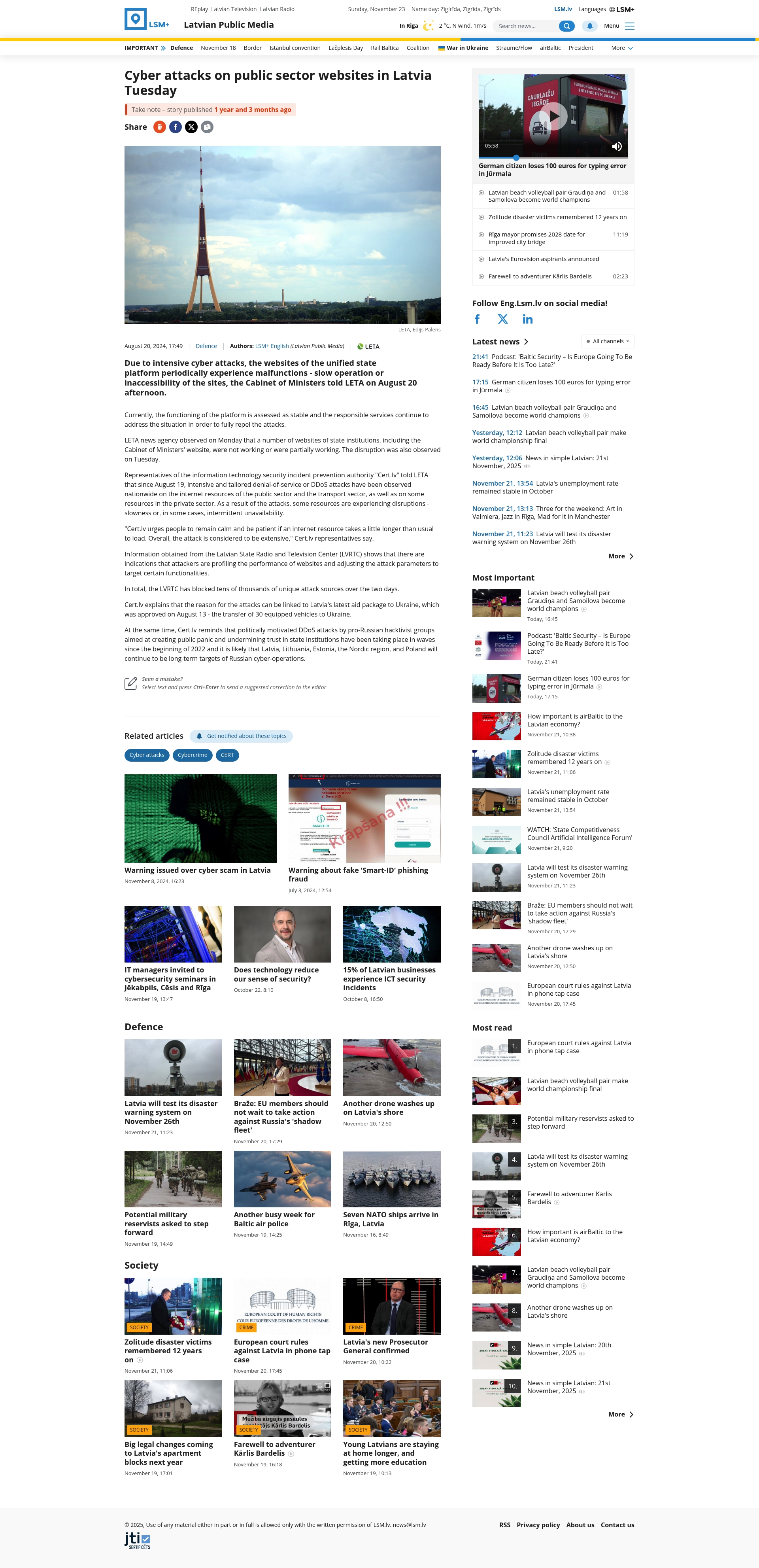 Headline: Cyber attacks on public sector websites in Latvia Tuesday