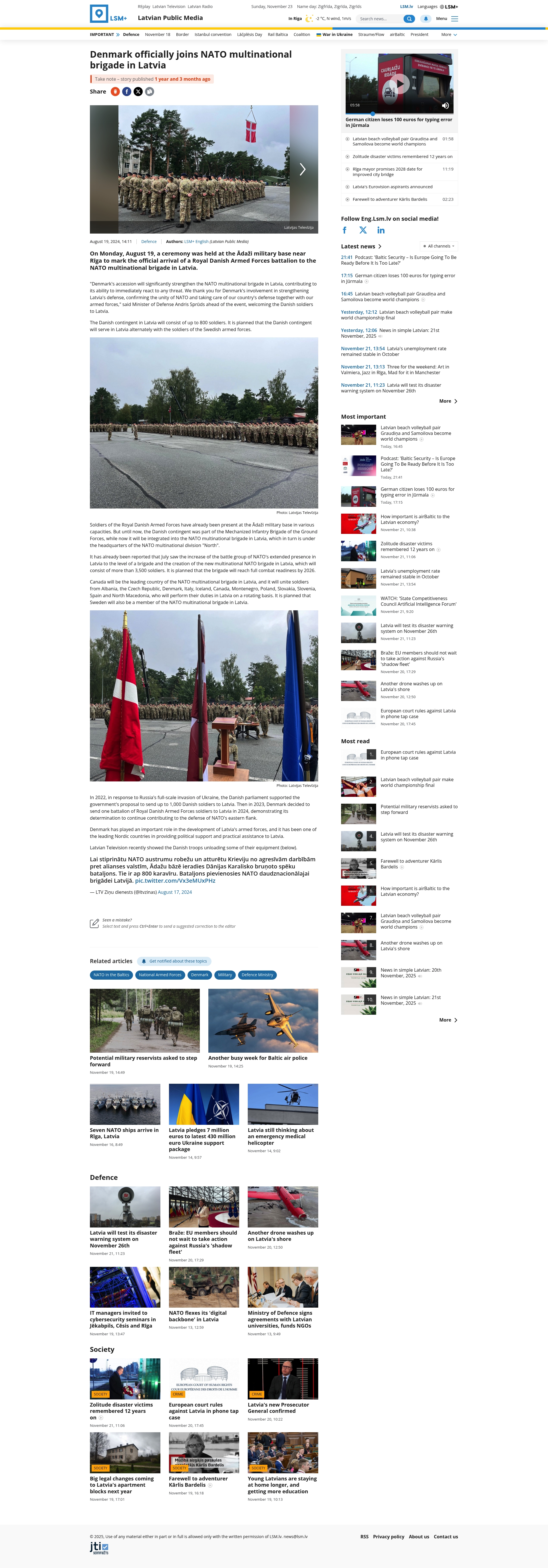 Notes: Denmark joins NATO multinational brigade in ??Latvia. Canada will be the leading country of the NATO multinational brigade in Latvia, and it will unite soldiers from Albania, the Czech Republic, Denmark, Italy, Iceland, Canada, Montenegro, Poland, Slovakia, Slovenia, Spain and North Macedonia, who will perform their duties in Latvia on a rotating basis. It is planned that Sweden will also be a member of the NATO multinational brigade in Latvia.