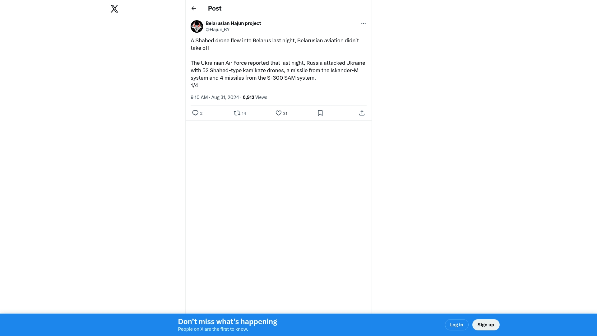 A Shahed drone reportedly flew into Belarus on the night of August 30–31, 2024. Belarusian aviation did not respond. Ukrainian Air Force reports Russia attacked Ukraine with 52 Shahed kamikaze drones, a missile from the Iskander-M system, and 4 missiles from the S-300 SAM system in the same period.
