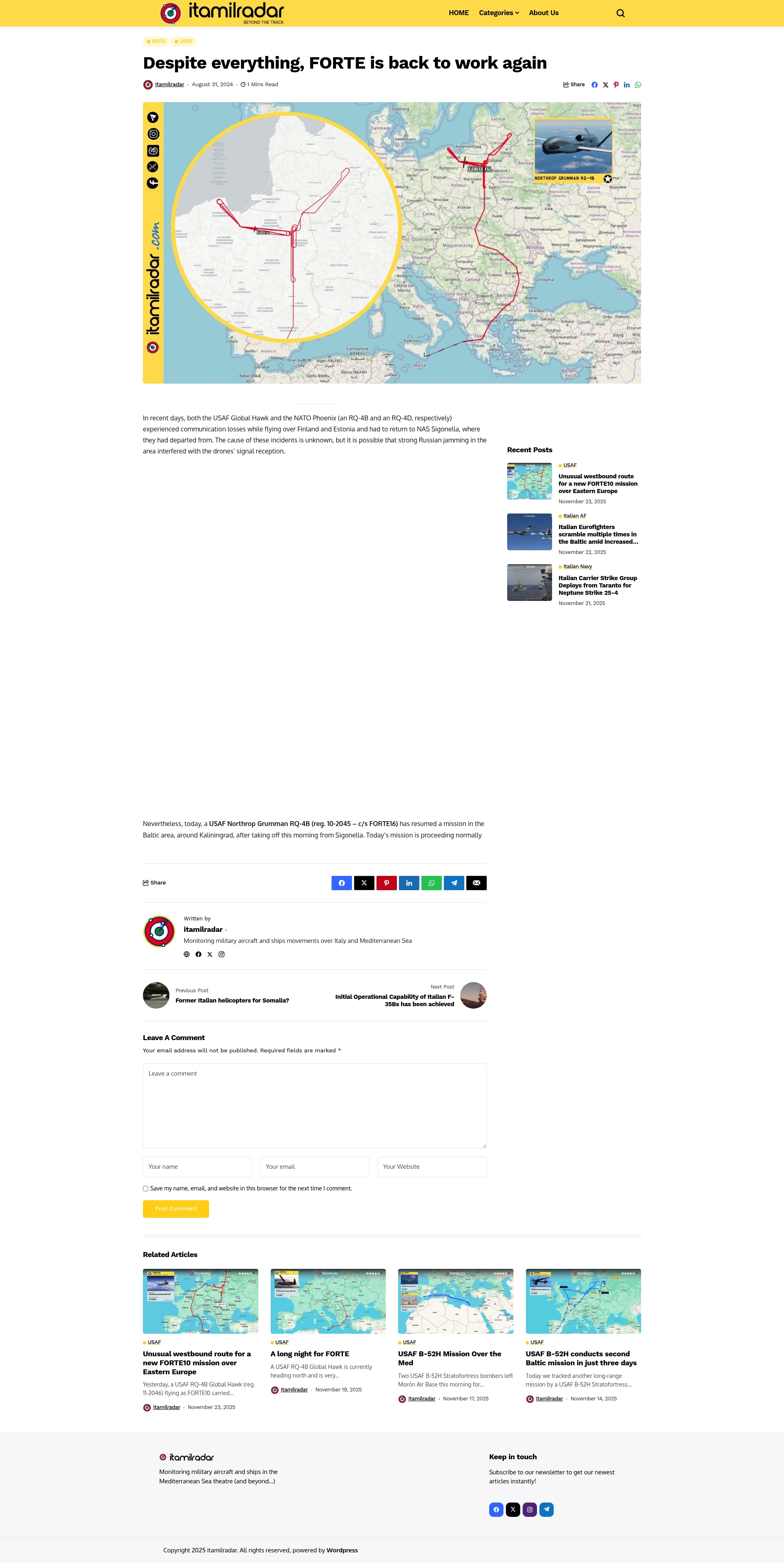 - "today, a USAF Northrop Grumman RQ-4B (reg. 10-2045 - c/s FORTE16) has resumed a mission in the Baltic area, around Kaliningrad, after taking off this morning from Sigonella. Today’s mission is proceed..."