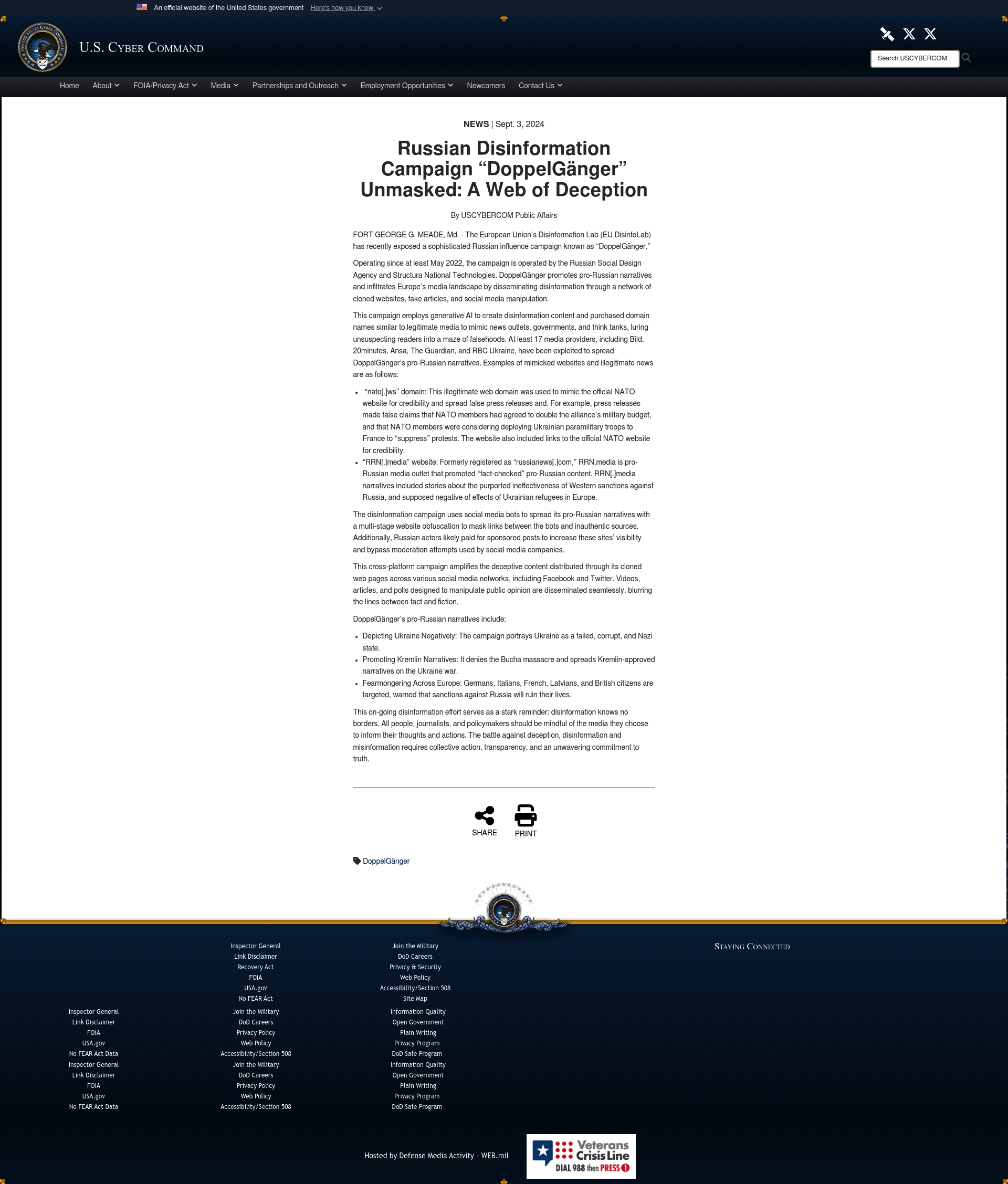 U.S. Cyber Command reports that the Russian disinformation campaign 'DoppelGänger,' operated by the Russian Social Design Agency and Structura National Technologies, has been unmasked. The campaign targets Western governments and societies with coordinated online deception, using fake media outlets and social media manipulation to spread Kremlin-approved narratives and undermine NATO and EU unity.