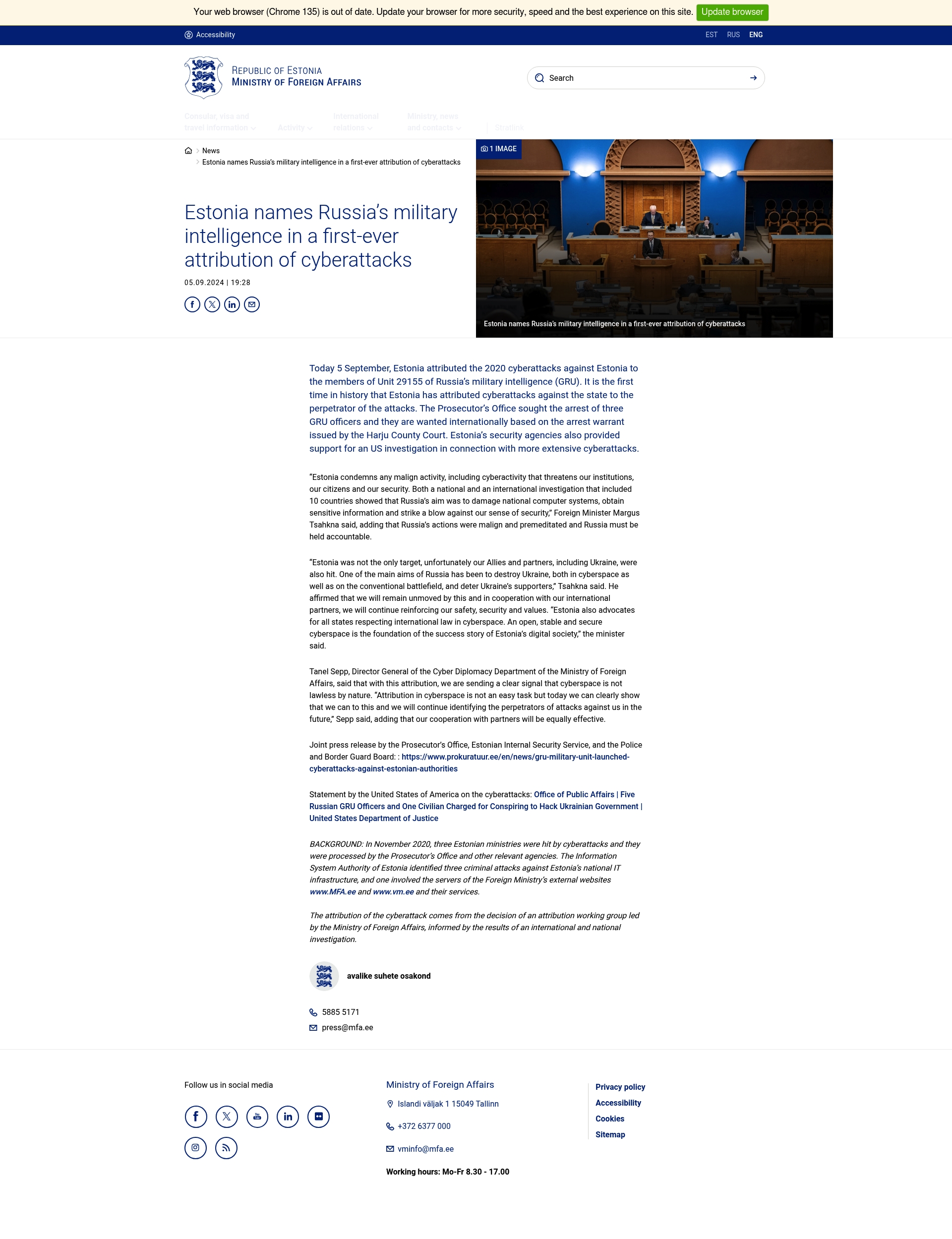 - "Today 5 September, Estonia attributed the 2020 cyberattacks against Estonia to the members of Unit 29155 at Russia’s military intelligence (GRU)."