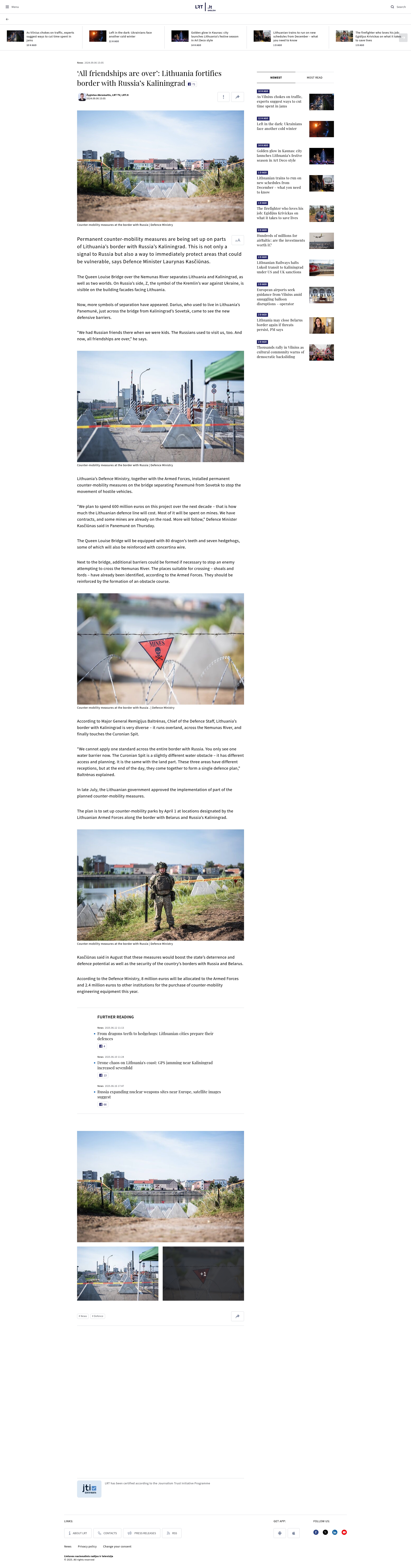 - "According to Major General Remigijus Baltrėnas, Chief of the Defence Staff, Lithuania’s border with Kaliningrad is given priority in permanent counter-mobility barriers, such as anti-tank hedgehogs an..."