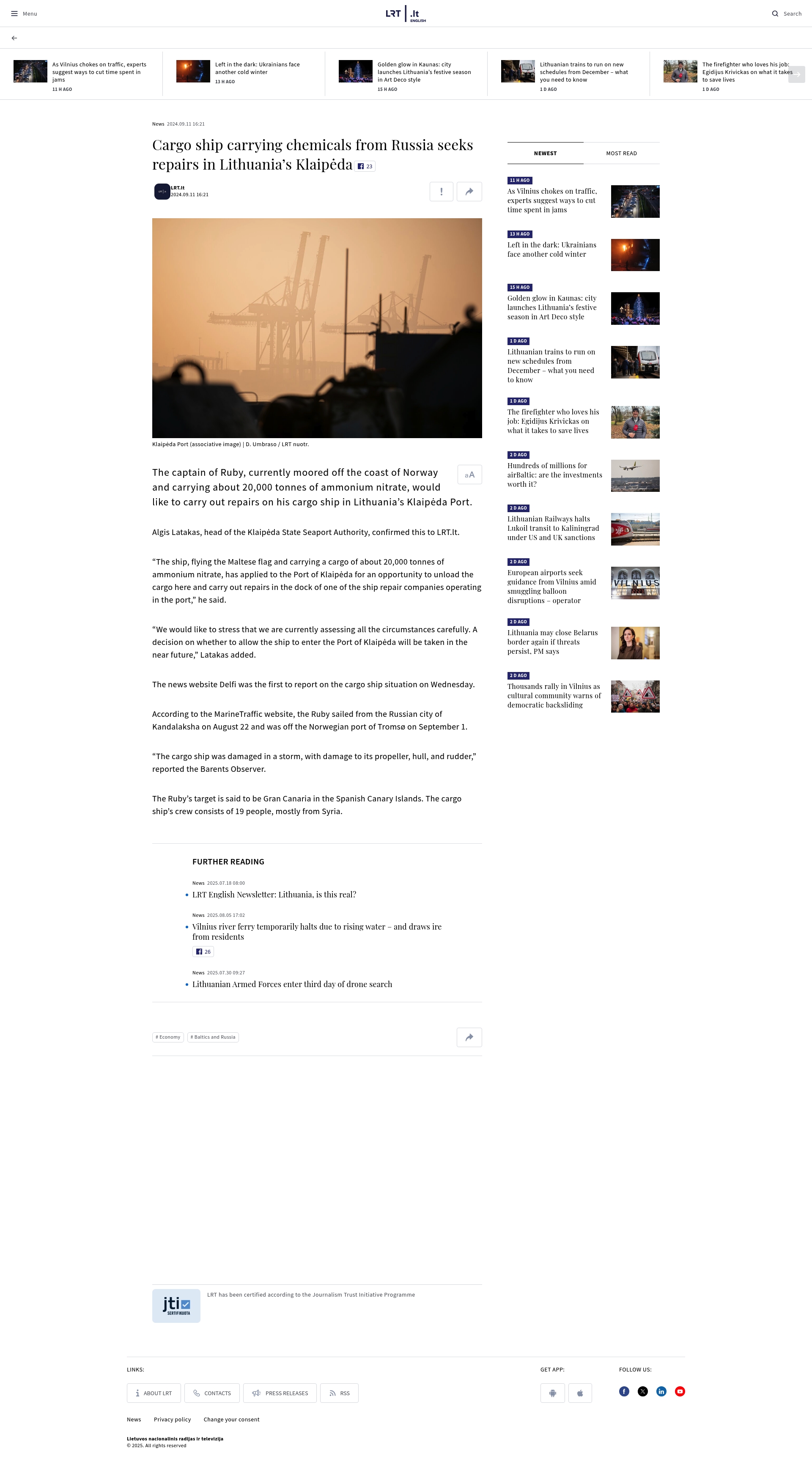 Headline: Cargo ship carrying chemicals from Russia seeks repairs in Lithuania’s Klaipėda
