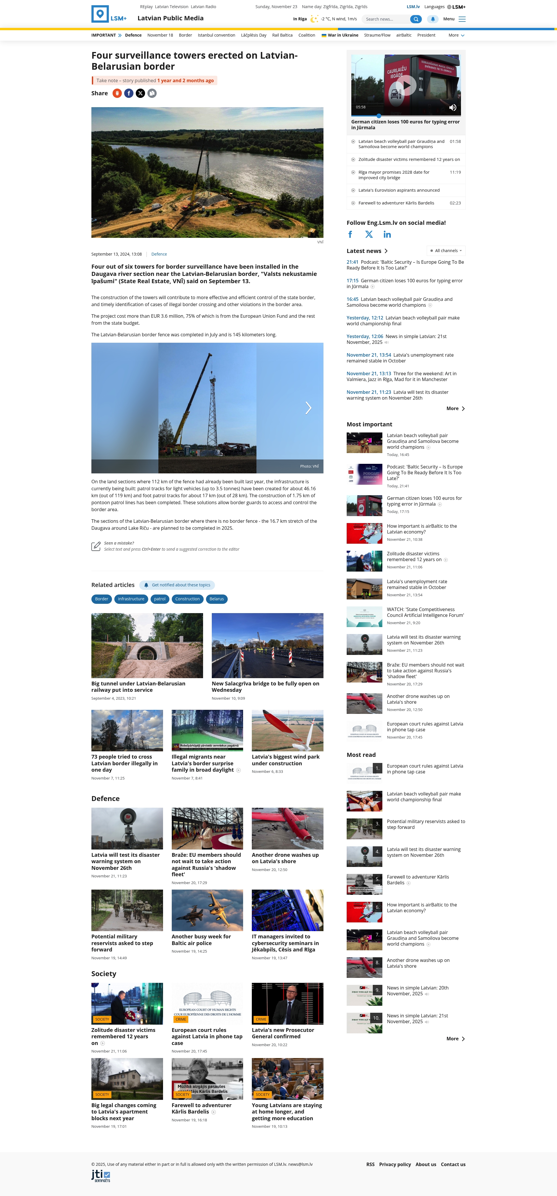 Headline: Four surveillance towers erected on Latvian-Belarusian border