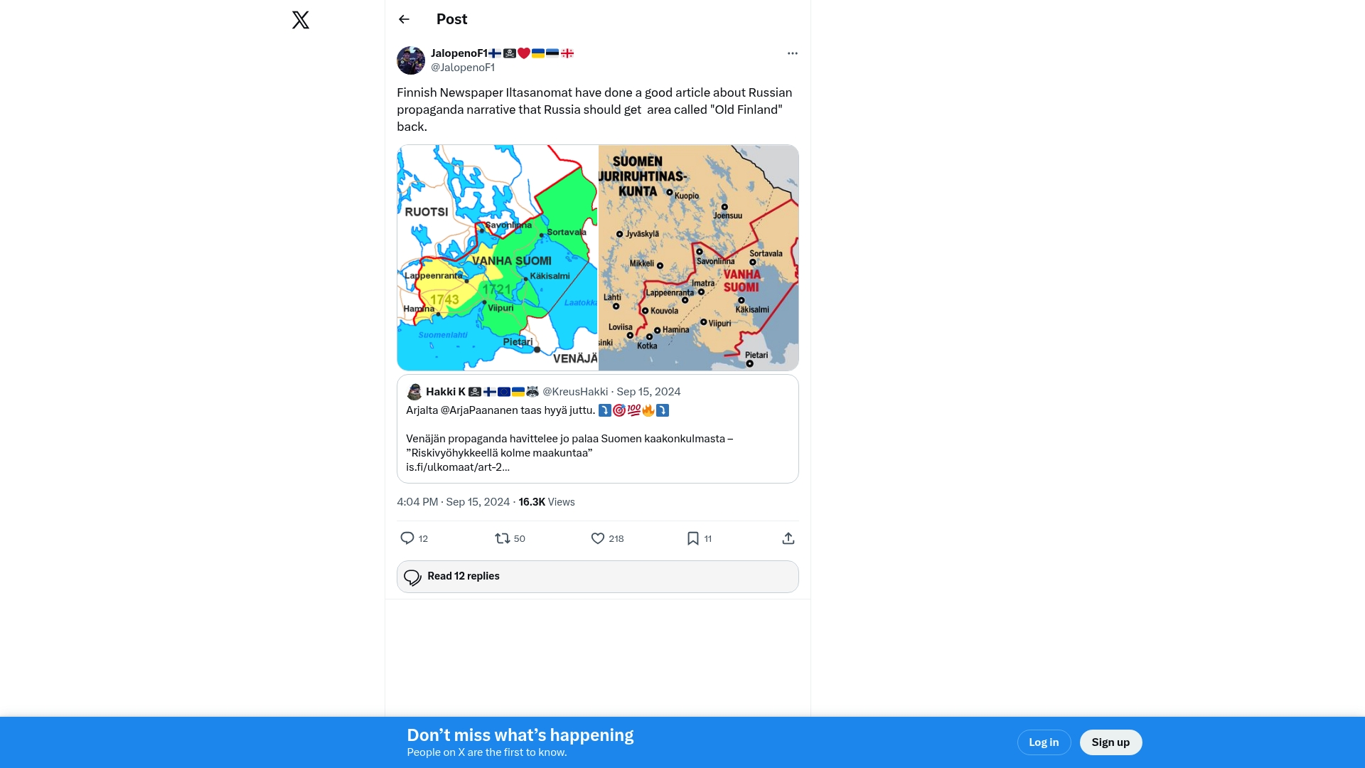 A Finnish newspaper, Iltasanomat, has published an article analyzing a Russian propaganda narrative that claims Russia should regain the area called 'Old Finland.' The X post highlights this media coverage, indicating the ongoing information operations regarding territorial claims against Finland.