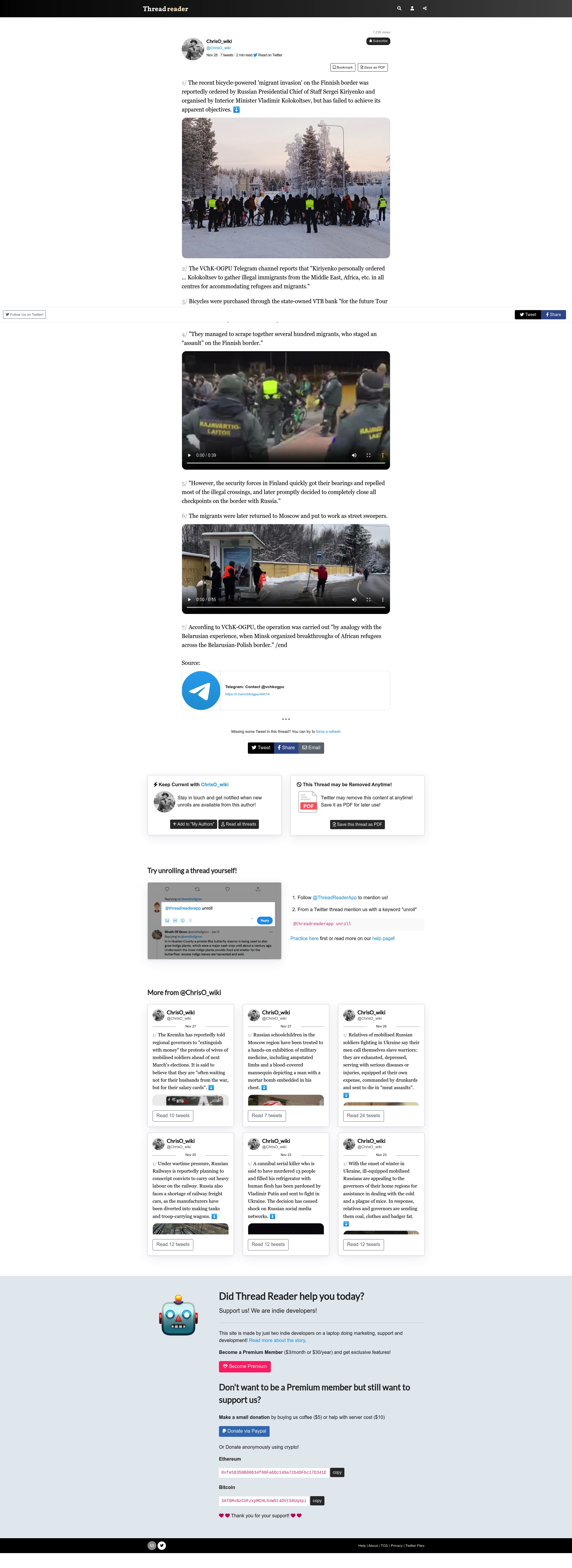 - "The recent bicycle-powered 'migrant invasion' on the Finnish border was reportedly ordered by Russian Presidential Chief of Staff Sergei Kiriyenko and organized by Interior Minister Vladimir Kolokolts..."