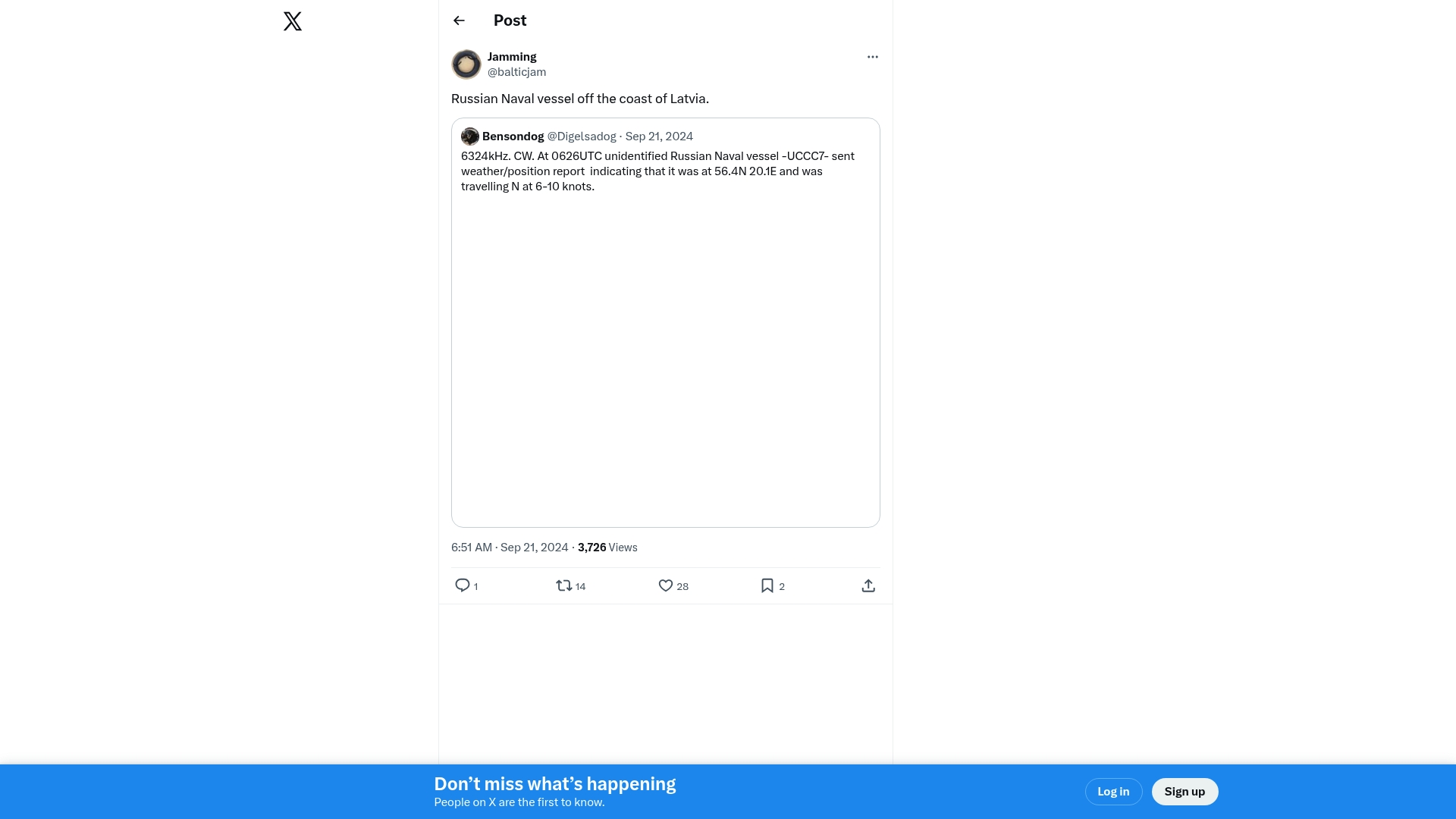 Notes: ??Russian Naval vessel off coast of ??Latvia reporting position