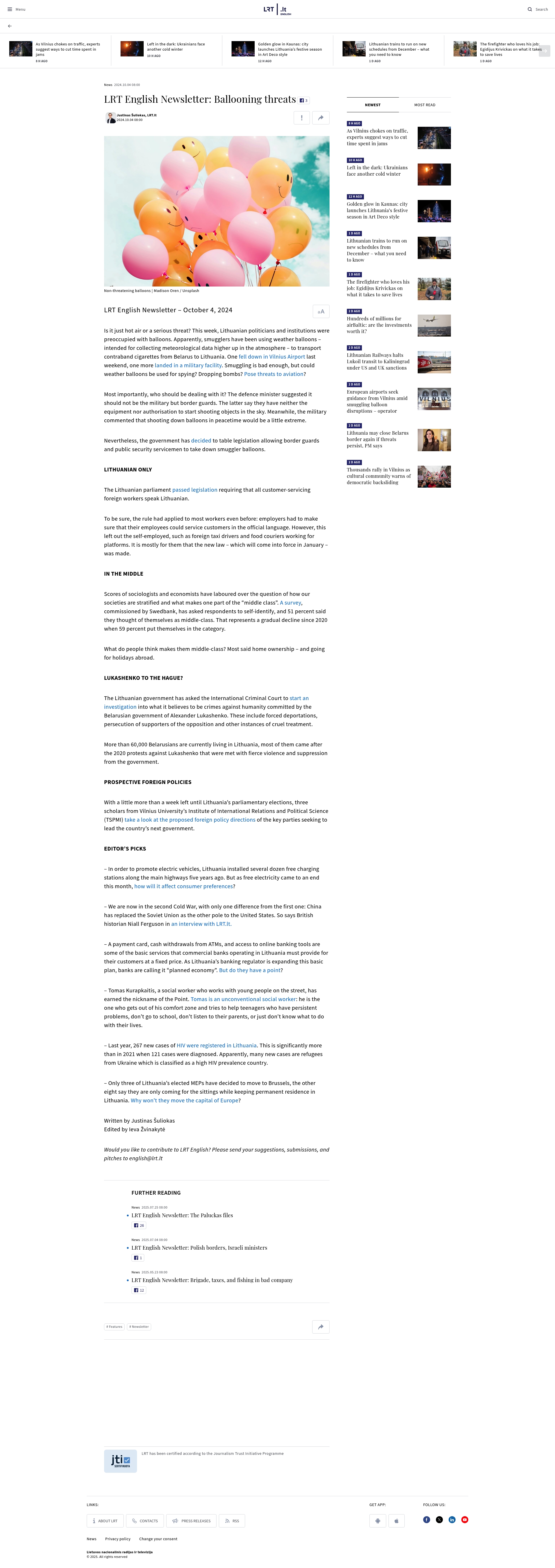 Lithuanian authorities expressed concerns about increased use of weather balloons, presumed for smuggling, meteorological data collection, and possibly espionage. There is legislative movement to empower border guards to down suspicious balloons.
